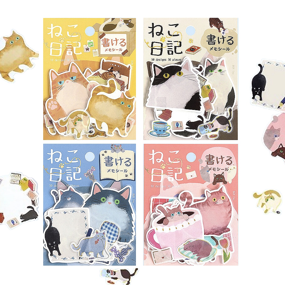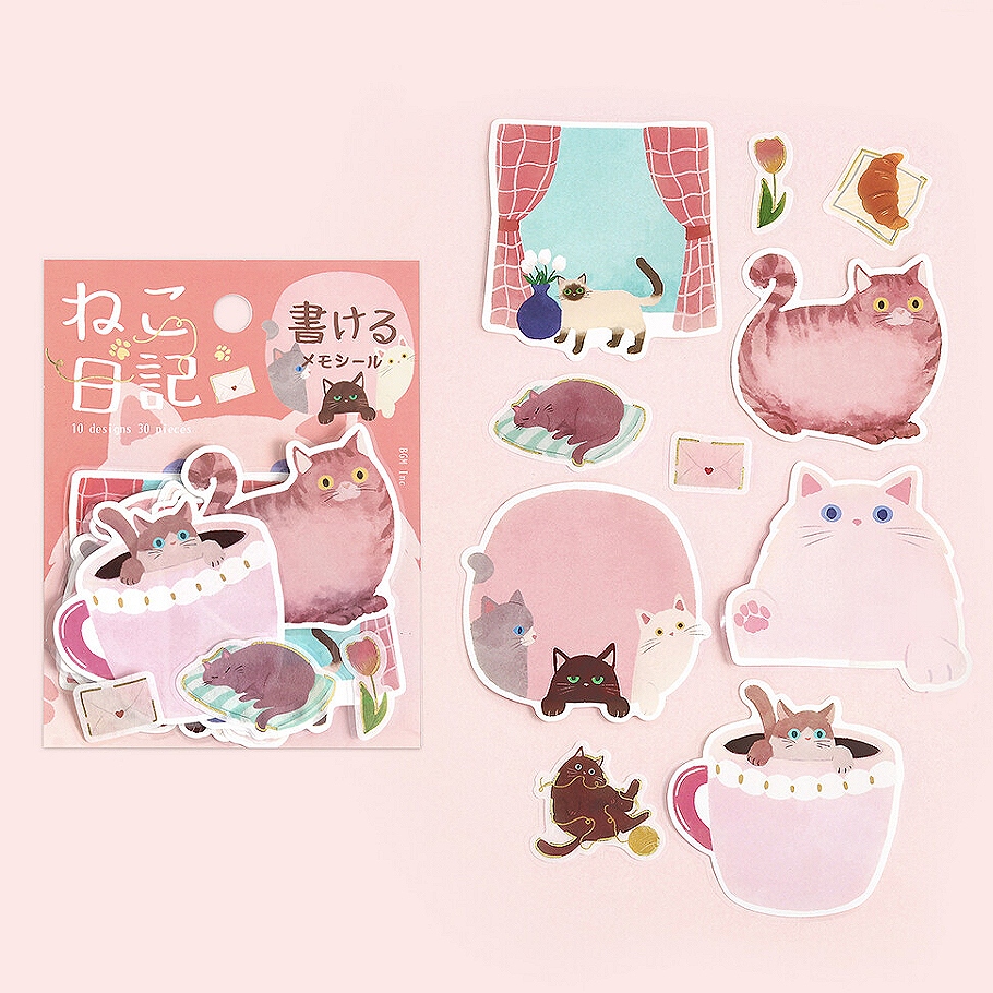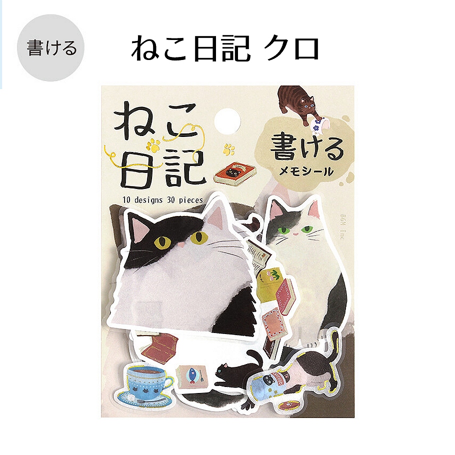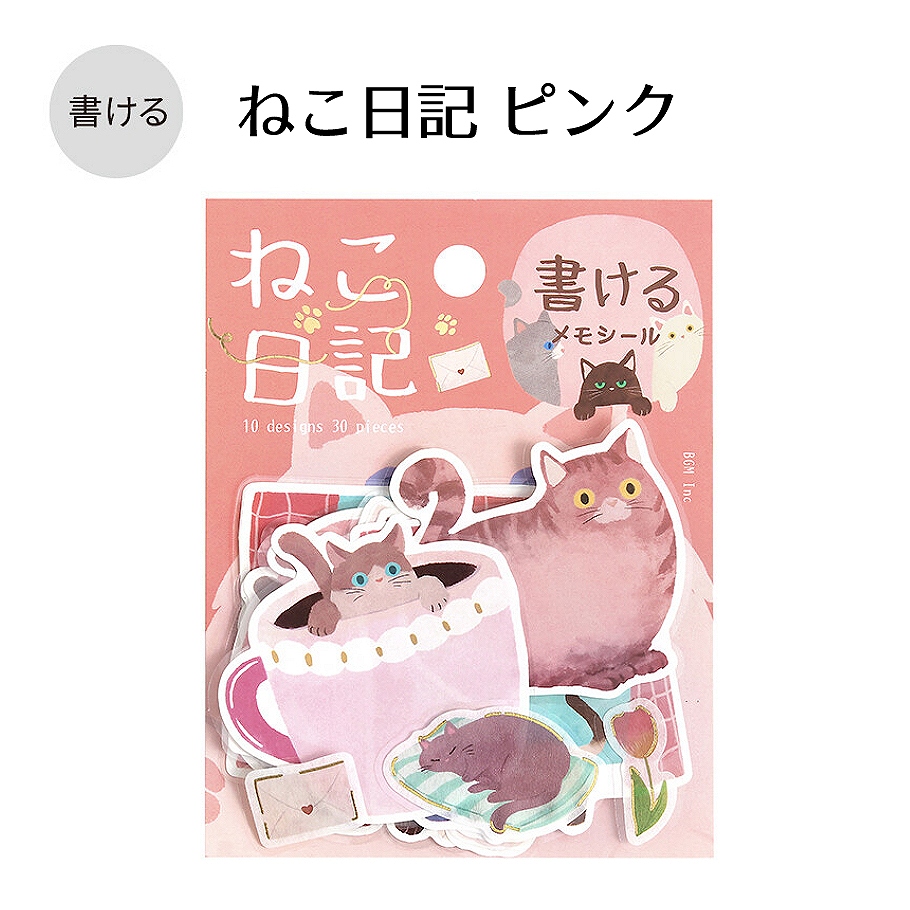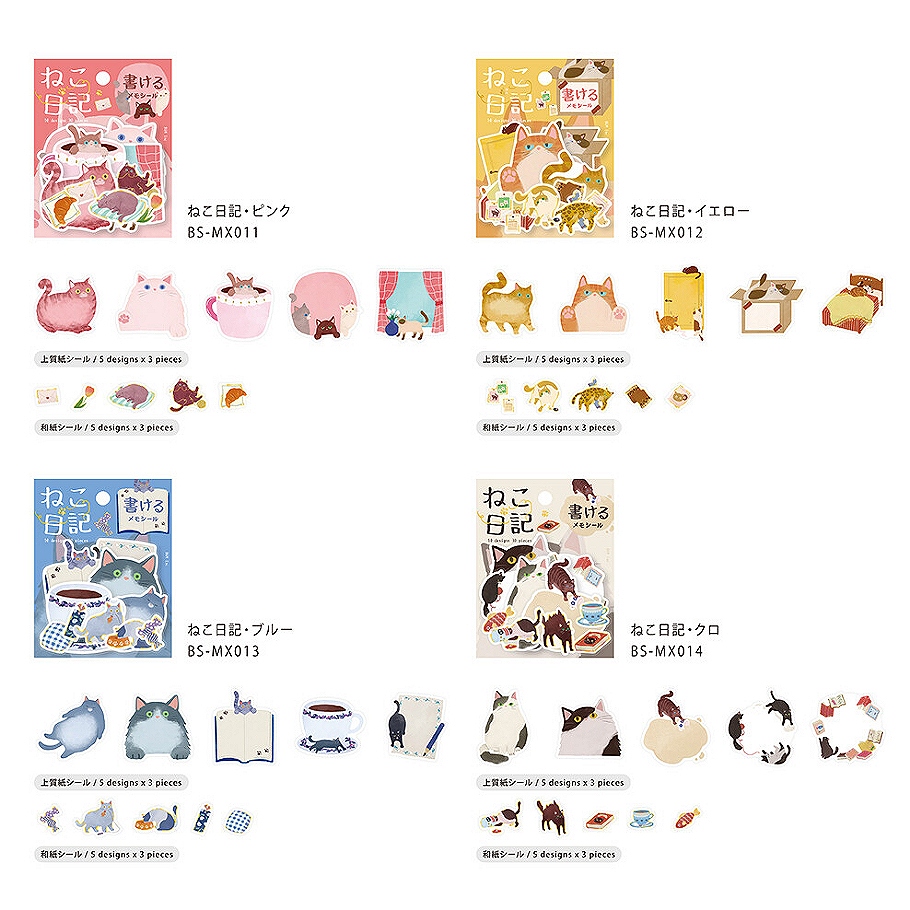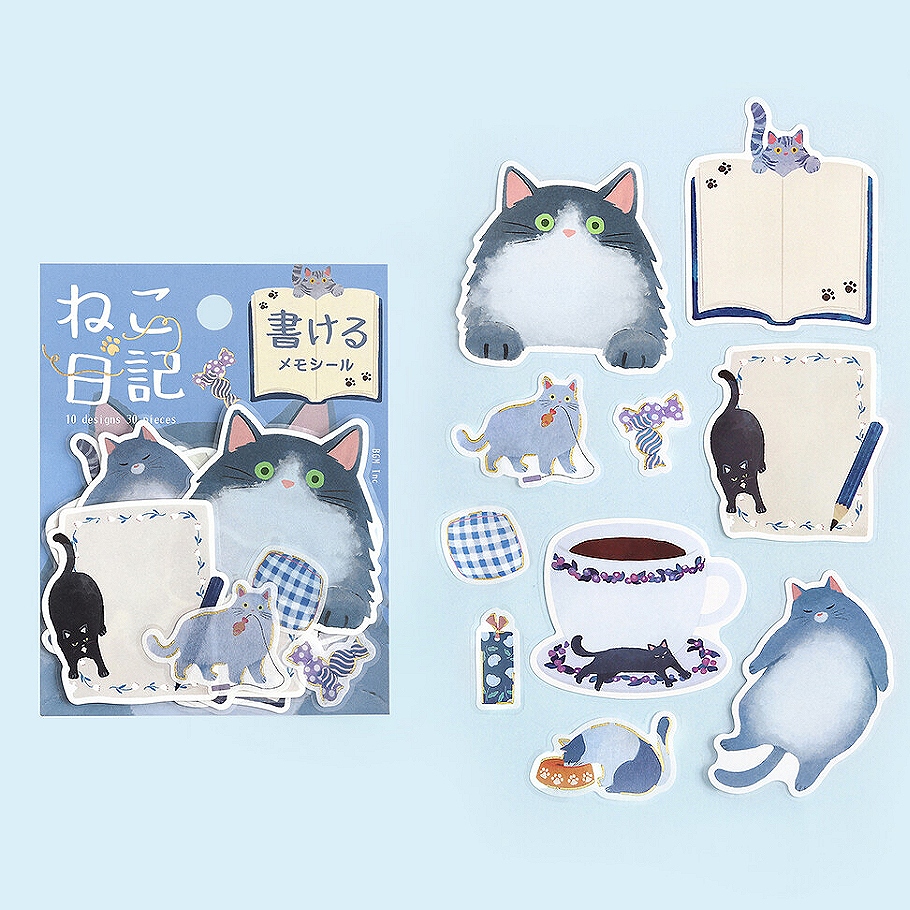 かわいい猫たちの日常を描いた、書き込めるメモシールのシリーズ「ねこ日記」。