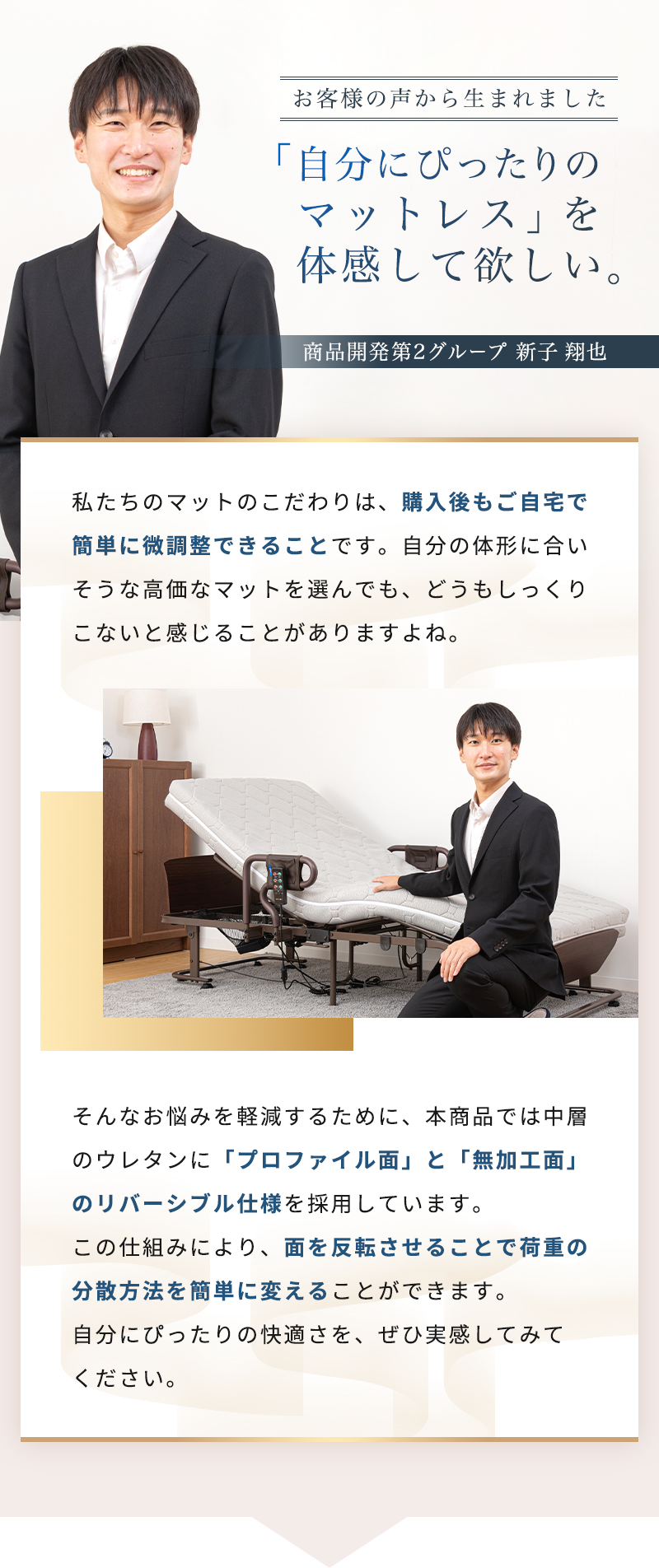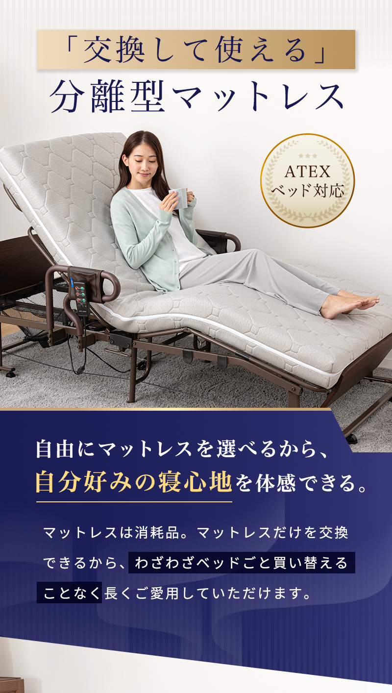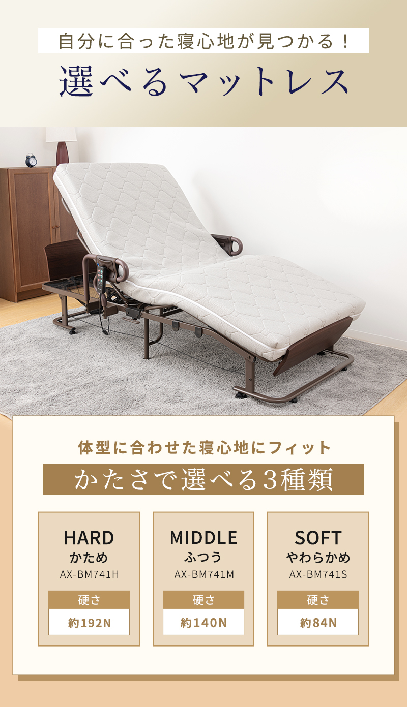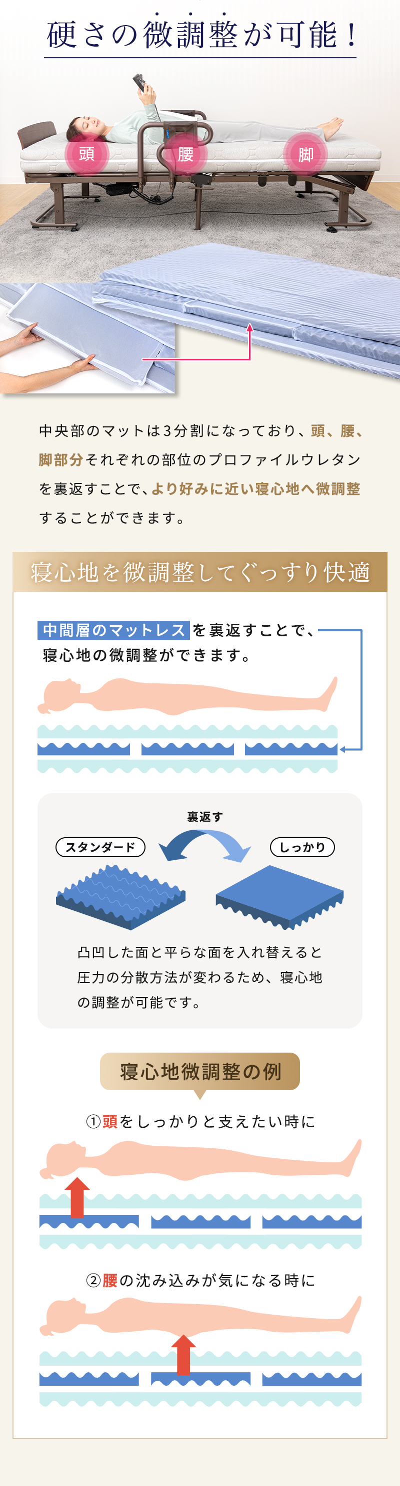 体型に合わせて寝心地が選べる3種類のマットレス。・HARD(かため、硬さ:約192N)・MEDIUM(ふつう、硬さ:約140N)・SOFT(やわらかめ、硬さ:約84N)自由にマットレスを選べるから、自分好みの寝心地を体感できる。マットレスを交換できるから、長くご愛用いただけます。マットレスは体型(BMI)で選びましょう。マットの硬さの微調整が可能。中央部のマットは3分割になっており、頭、腰、腰部分それぞれの部位のプロファイルウレタンを裏返すことで、より好みに近い寝心地へ微調整できます。