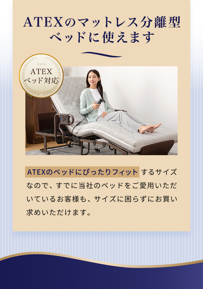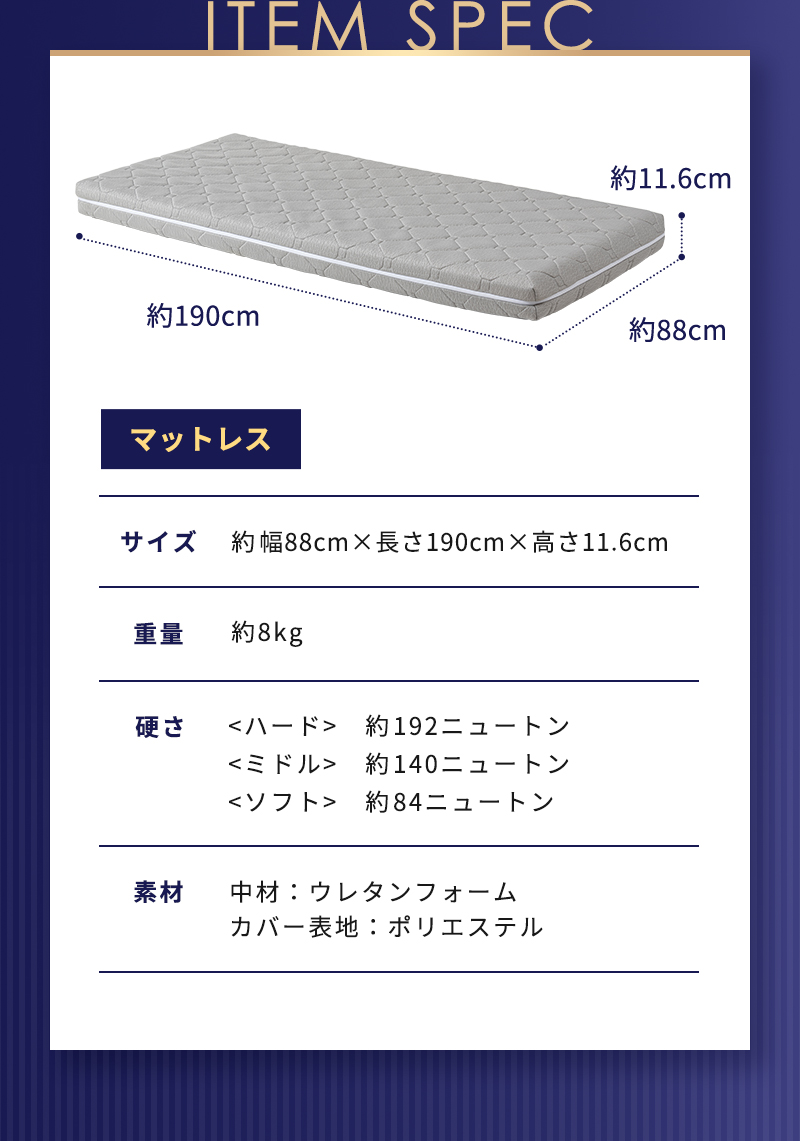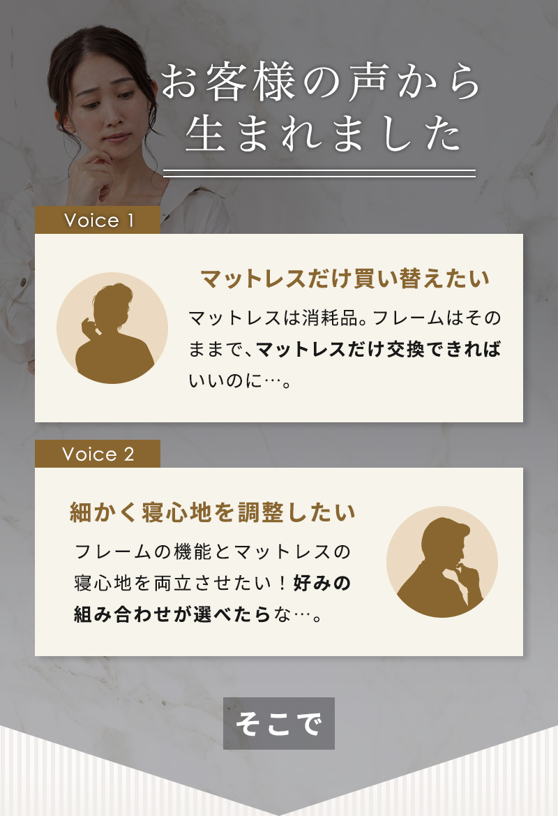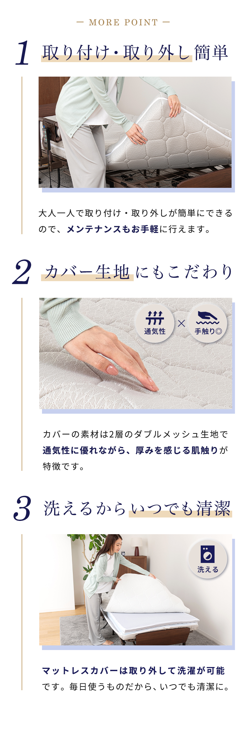 体型に合わせて寝心地が選べる3種類のマットレス。・HARD(かため、硬さ:約192N)・MEDIUM(ふつう、硬さ:約140N)・SOFT(やわらかめ、硬さ:約84N)自由にマットレスを選べるから、自分好みの寝心地を体感できる。マットレスを交換できるから、長くご愛用いただけます。マットレスは体型(BMI)で選びましょう。マットの硬さの微調整が可能。中央部のマットは3分割になっており、頭、腰、腰部分それぞれの部位のプロファイルウレタンを裏返すことで、より好みに近い寝心地へ微調整できます。