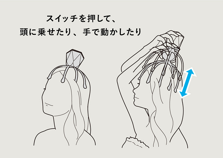 スイッチを押して、頭にのせるだけ。上下にゆっくり動かし、頭皮全体を包み込むように刺激します。