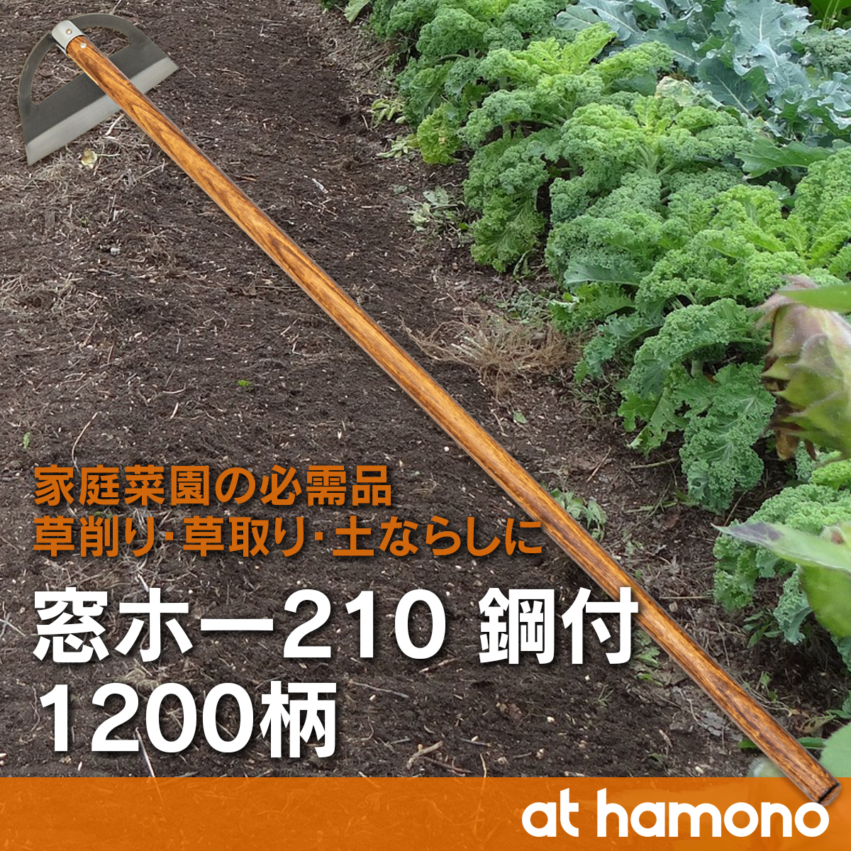 立鎌の一種である「窓ホー」。柔らかい草の草刈りに向いていて、先端が半月型になっていて中心に穴が開いているため、刈るたびに外に草を排出でき、刈った草が溜まったり絡まったりすることなくスムーズに作業が進みます。草を刈るだけではなく、草削りや草抜き、土寄せ、土ならしも行える万能型です。全長1m20cmの一般的なサイズとなっていて家庭菜園や畑作業にとても便利な一本です。