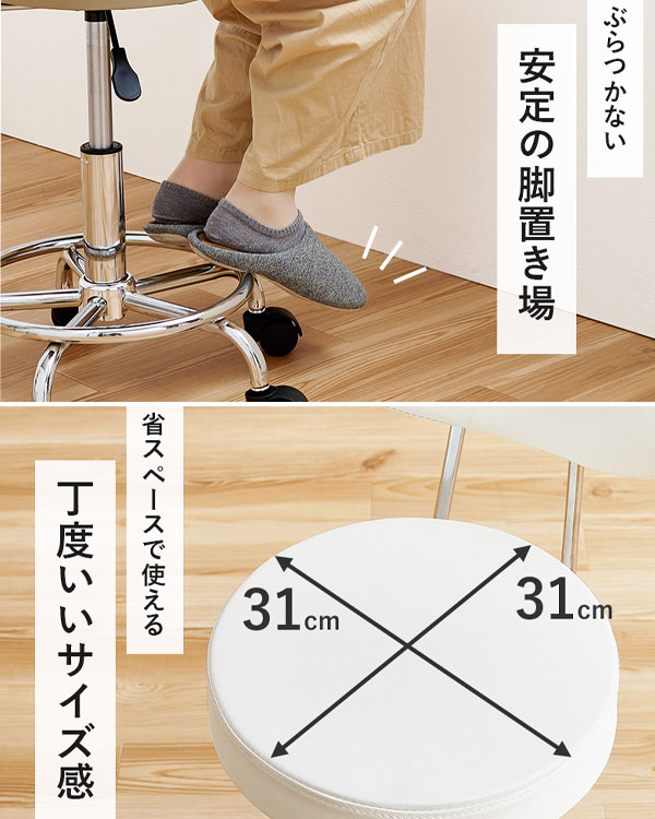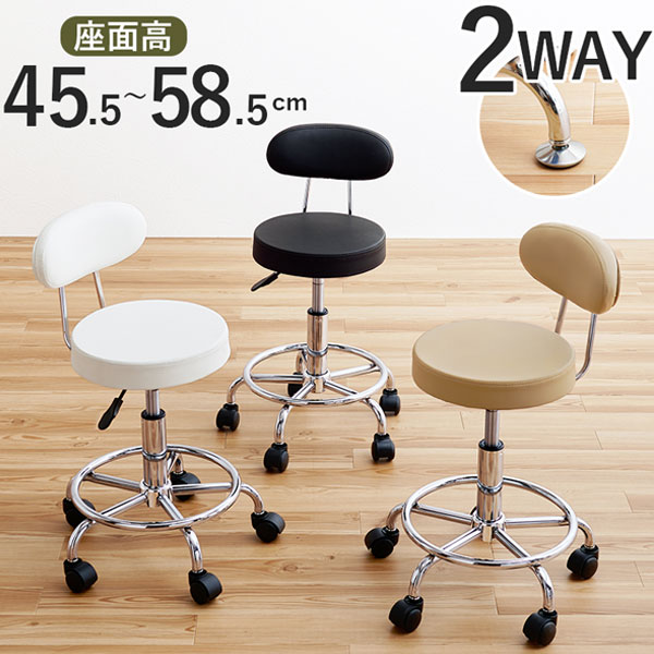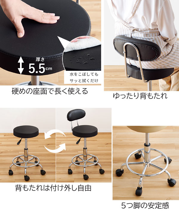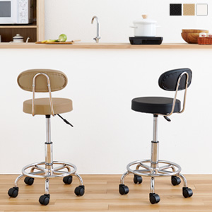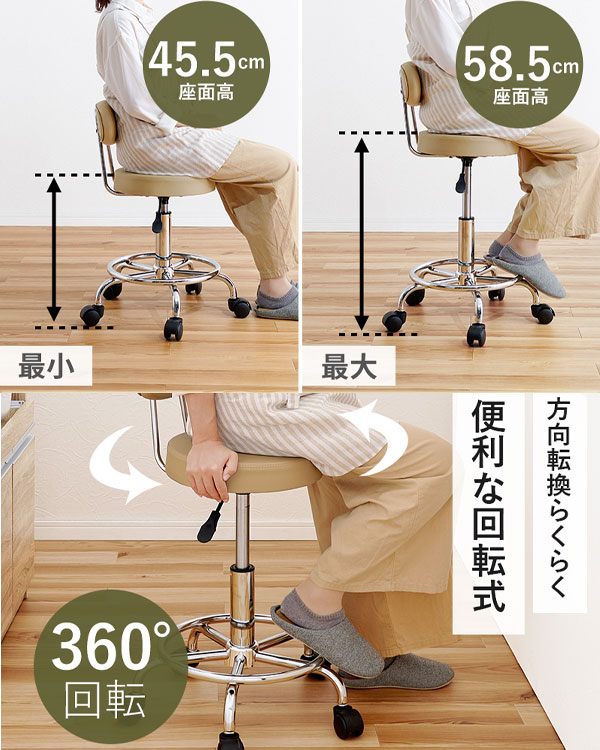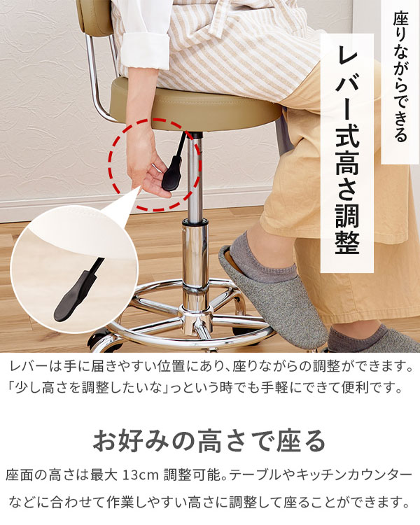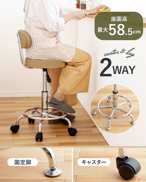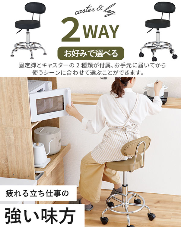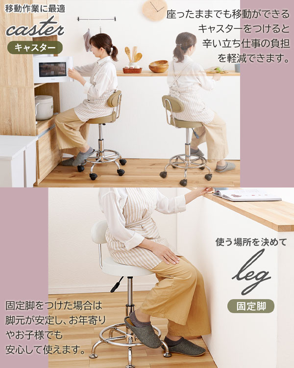 立ち仕事の強い味方!キャスター付きで移動がしやすく、テーブルやキッチンカウンターに合わせて、作業しやすい高さに調節可能な弁輪キッチンチェアです。固定脚とキャスターの2種類の脚が付属しているので、シーンに合わせて2WAYで使えます。座りながらでも簡単にレバーで高さが調整できます。360度回転式で、自由に動け、キッチンでの作業もはかどりますね。カラーは、ベージュ、ホワイト、ブラックの3色からお選び頂けます。オシャレで使い勝手のよい昇降式キッチンチェアです。