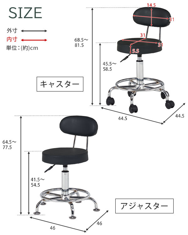 ■サイズ(約) キャスター時:幅44.5×奥行44.5×高さ68.5〜81.5×座面高45.5〜58.5cm、アジャスター時:幅46×奥行46×高さ64.5〜77.5×座面高41.5〜54.5cm