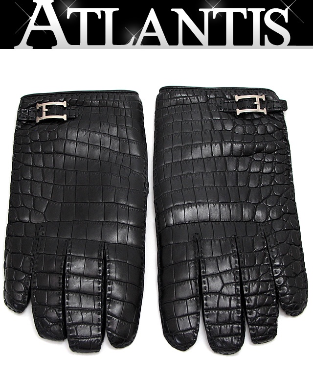 エルメス HERMES クロコダイル アリゲーター 手袋 グローブ H金具 黒 S金具 Size81/2 メンズS相当