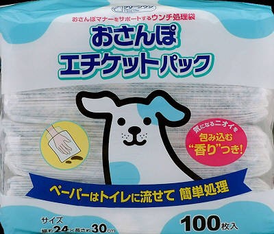 「クリーンワン おさんぽエチケットパック 100枚」は、静電気で袋が開きにくくなることがなく、排便後すぐにウンチを拾うことができるエチケットパック(犬用お散歩グッズ)です。ポリ袋からティッシュとウンチを取り出せば、水洗トイレに流せます。ポリ袋はかわいいイラストが描かれ、見た目もキュート。さわやかな香り付き。お得な100枚入り。