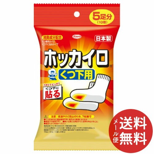 【商品説明】使用方法用途など:靴下に貼るタイプのカイロ。シールをはがして揉まずに靴下の上から貼って下さい。効能効果:最高温度41度 平均温度35度 持続時間5時間使用上の注意:温かさを感じなくなったらすぐにはがす。保管保存方法:直射日光を避け涼しい所に保管して下さい。幼児の手の届く所に置かないで下さい。賞味期限等:有効期限記載有り。期限4年問い合わせ先:お客様相談センター。03−3279−7560原産国:日本商品サイズ:105×190×25広告文責:アットライフ株式会社TEL 050-3196-1510※商品パッケージは変更の場合あり。メーカー欠品または完売の際、キャンセルをお願いすることがあります。ご了承ください。