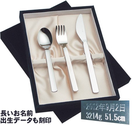 この3本セットのみ 表面≪ローマ字20文字or漢字ひらがな10文字≫の名入れが可能です!フルネームもOK、ちょっとしたメッセージや(スプーンの裏面のみ)出生体重・身長まで刻印できます♪