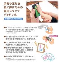手足につけた色が落としやすく、子どもの肌に対して安心して使うことができる水性顔料系インキを使った手形スタンプパッド「パームカラーズ」と作品用台紙3枚(A5・14.8×21cm)・飾り付けシール3作品分・飾り付け専用ペン黒・木製フレーム(スタンド脚付き)のセットです。