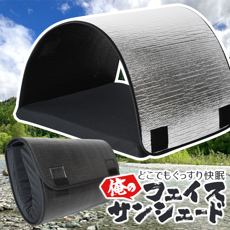 本商品はたとえばアウトドアにおいて昼寝などに用いることができる日除けマットであり、四角形のマット部とカバー部とを備えている。マット部とカバー部のあいだに形成される空間に、使用者が頭部を挿入して横臥する。このとき、使用者の顔面が表面に熱反射層が形成されカバー部で覆われる。このため太陽光線は上記熱反射層で反射され、使用者の面前は裏面の光吸収面により暗くなる。このため、たとえばアウトドアでの昼寝などにおいて、日光を遮り、目の前を暗くして快適に眠ることができる。上記熱反射層は、屋外日中の太陽光線だけでなく、室内の照明光を遮ることもできる。また、使用中は使用者の耳の周りがマット部とカバー部によって囲われるため防音効果がある。したがって、本考案の日除けマットは、アウトドアでの昼寝に限らず、屋内での就寝に使用することも可能である。
