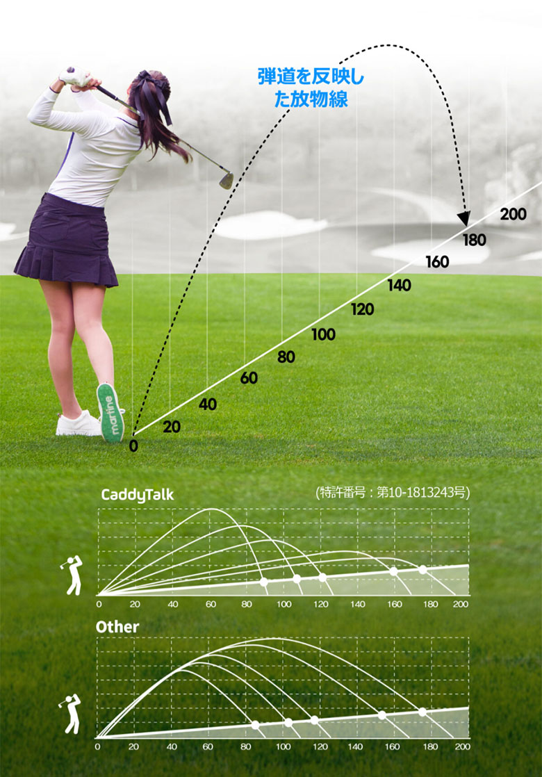 山岳コースで発生する高低差やボールの弾道までも考慮してより正確な補正(おすすめ)距離をお知らせします。