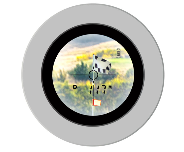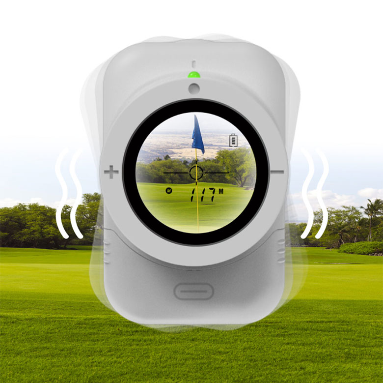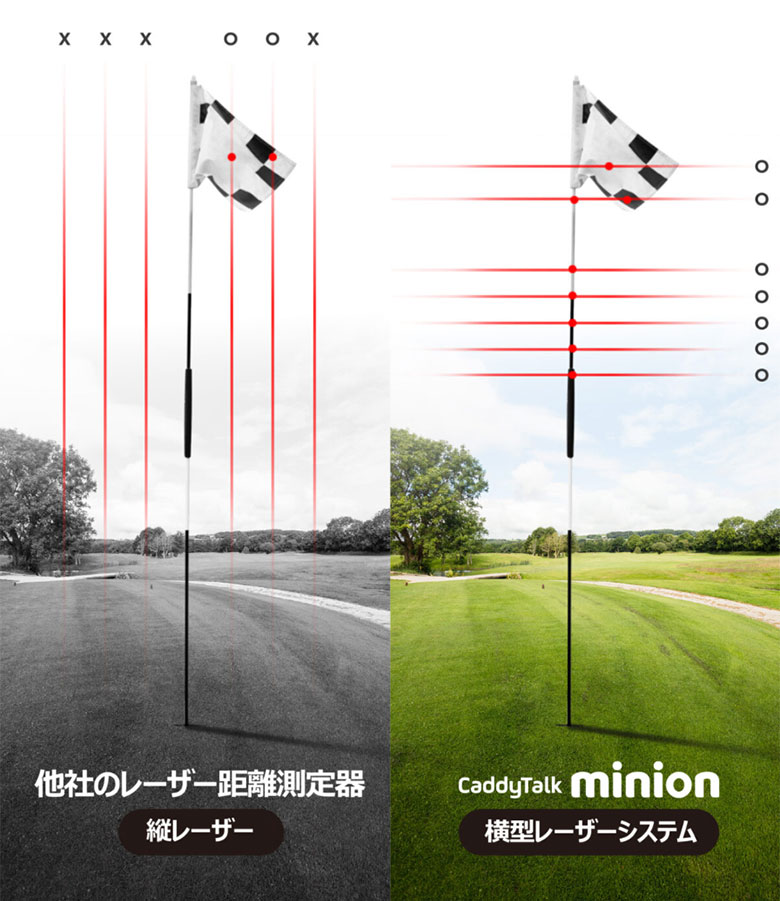 多くの距離測定器は縦型レーザーであるため、少しずれただけでも間違ったターゲットまでの距離を測ることになりますが、キャディトークは横型レーザーで正確にピンを測定することができます。