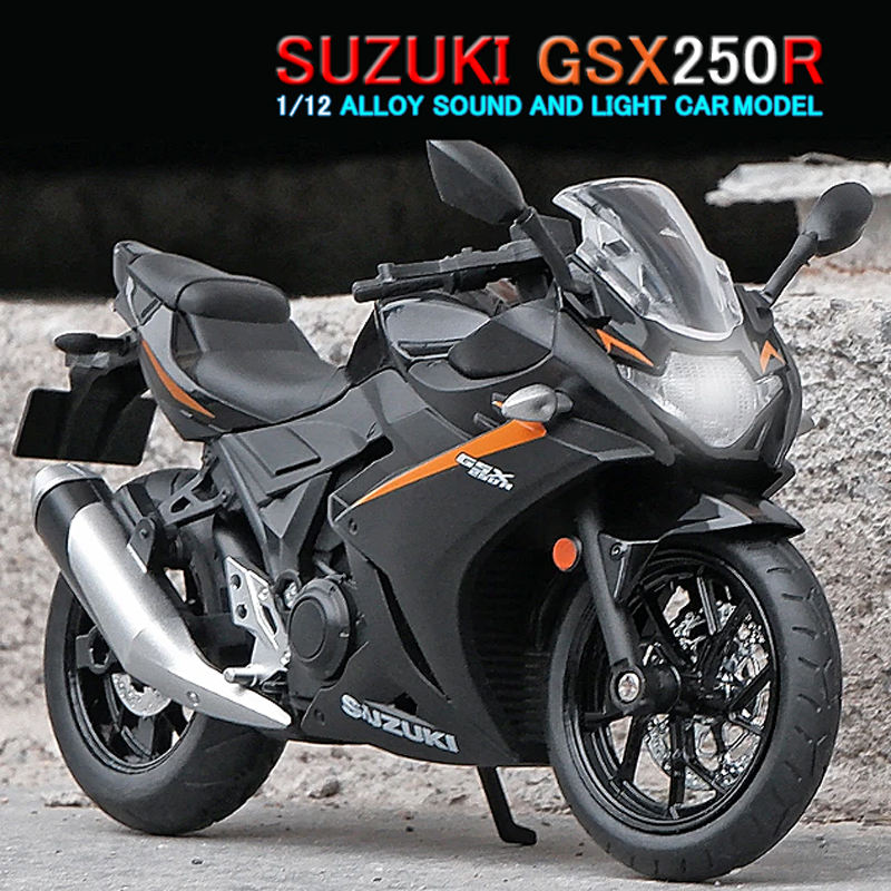 「 紹介動画 スマートフォン版 」 ← Click here「 紹介動画 ー P C 版 ー 」 ← Click hereGSX 250R 1/12スケールのミニカーが登場しました!全3色展開で、ライトが点灯し、エンジンサウンドも再現された合金モデルです。細部までこだわったディテールと高い再現性で、本物のバイクを手のひらサイズで楽しむことができます。