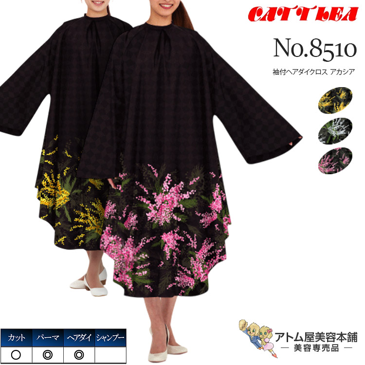 カトレア No.8510 袖付ヘアダイクロス アカシア 防水加工 カット パーマ ヘアダイ パーマ 花柄 プリント 日本製 業務用 プロ用 美容室 理容室 床屋 理美容 業務用 プロ用 サロン バーバー 美容専売 サロン専売 カトレア本舗 Cattlea