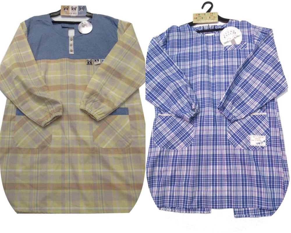 (割烹着 ワンちゃん 後開きロングエプロン ゆったり ネイビーxカラシ )(割烹着 スマホ対応ポケット付き チェック柄 後開きロングエプロン ゆったり ブルー)