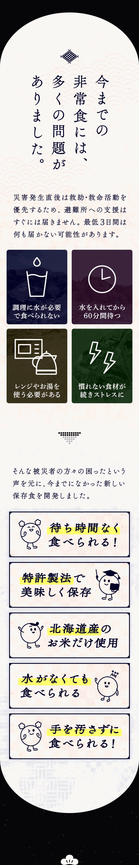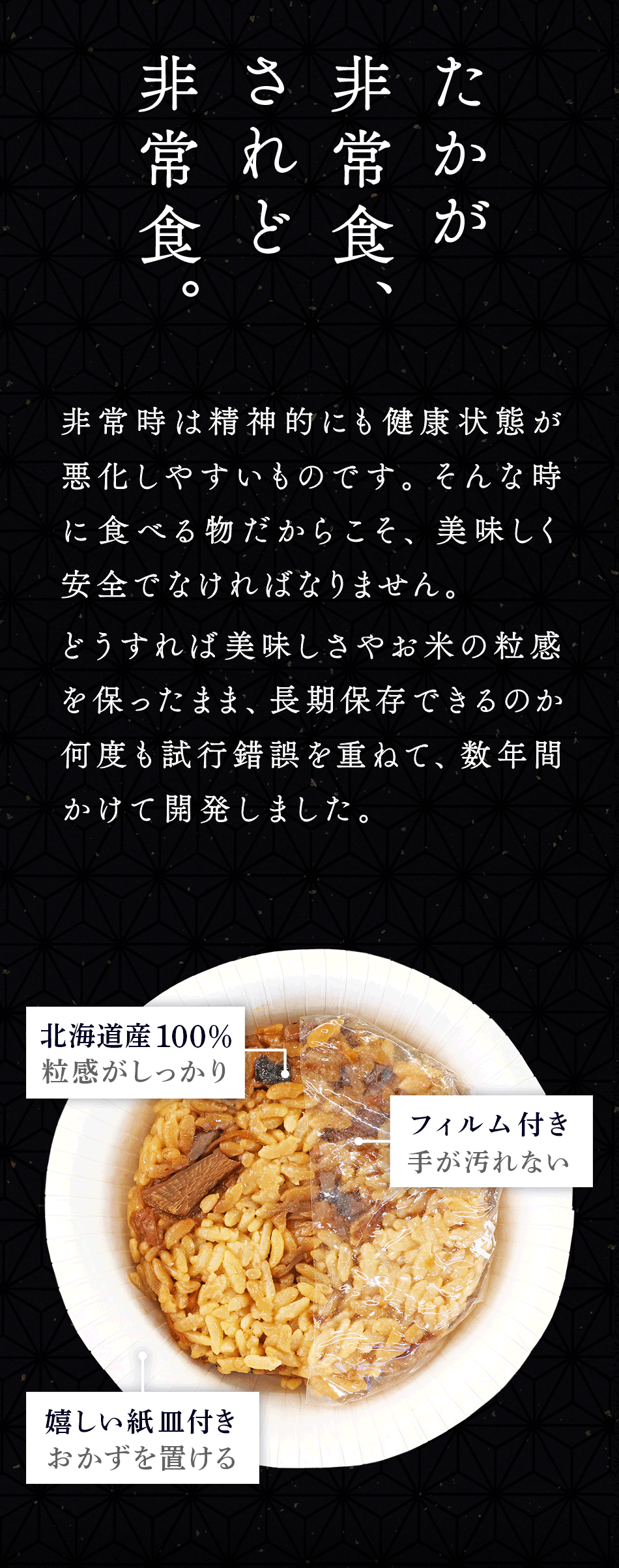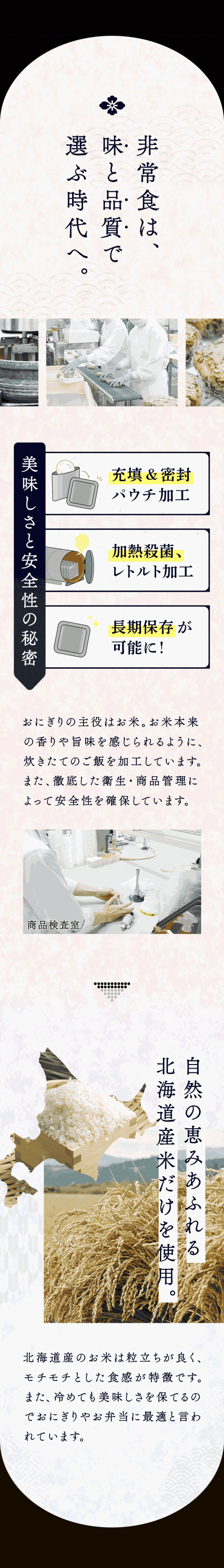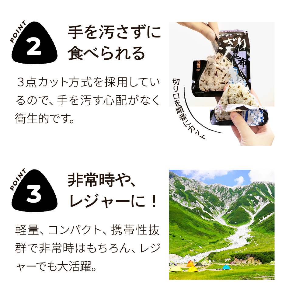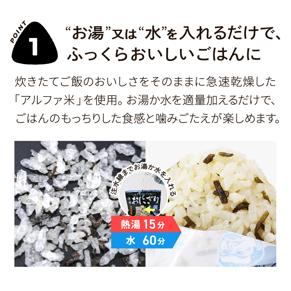| 使用方法 | 袋(パウチ)を開け、おにぎり・紙皿を取り出し、おにぎりのフィルムを剥がしてからお召し上がりください。 紙皿はおにぎりやおかずを載せる容器としてご利用ください。 また、封を切らずに10〜15分程度湯煎していただくとより一層美味しく召し上がれます。 電子レンジを使用する場合は、袋(パウチ)のまま加熱せず、袋からおにぎり・紙皿を取り出し、おにぎりのフィルムを剥がして器に移してから加熱してください。 ※目安/500Wで1分、600Wで30秒程度(なお紙皿を器にしてレンジで加熱する場合は、目安時間を守ってご使用ください) | |