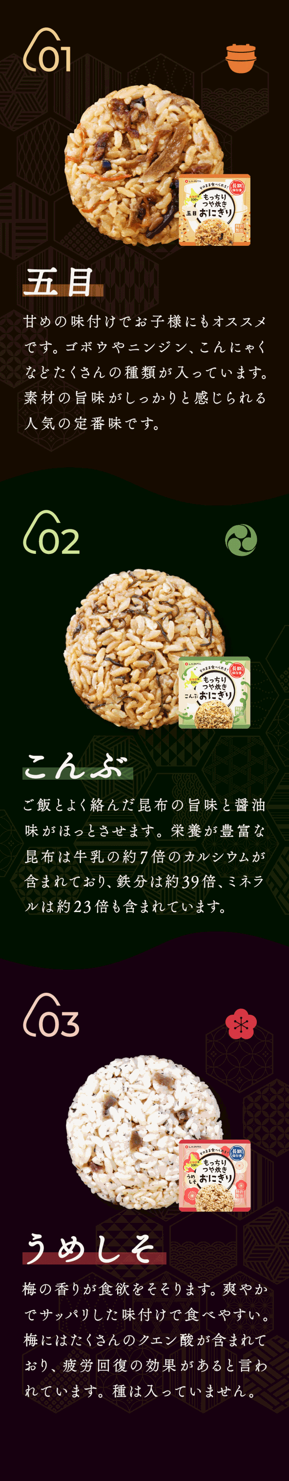 | 携帯おにぎり 五目おこわ×2個 | 原材料名 | もち米(国産)、うるち米(国産)、味付乾燥具材(食用植物油脂、醤油、砂糖、乾燥人参、油揚げ、乾燥ごぼう、乾燥しいたけ、こんにゃく、食塩) / ソルビトール、調味料(アミノ酸)、酸化防止剤(ビタミンE)、(一部に小麦・大豆を含む) |