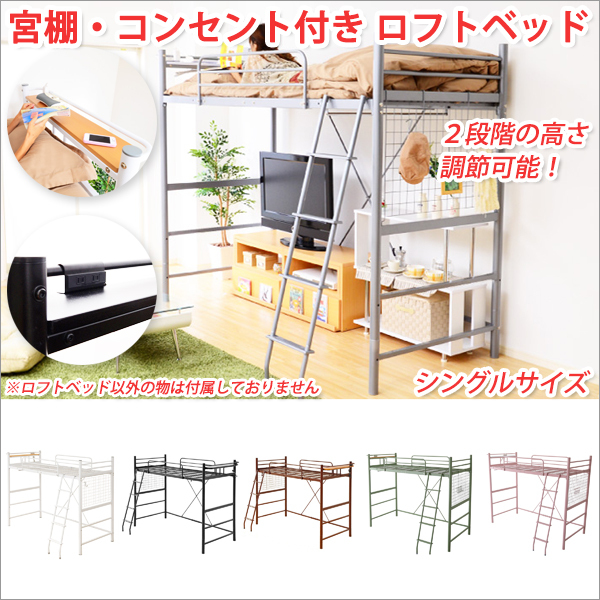 ロフトベッド ハイタイプ ロフトベット ハイタイプ ロフトベッド 高さ調節可能 宮棚・コンセント付き ロフトベッド シングルサイズ パイプベッド シングル