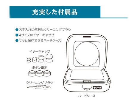 | 付属品 | ハードケース イヤーキャップ(大、中、小、特小の4種類) クリーニングブラシ ボタン電池(LR44相当)×3個 |