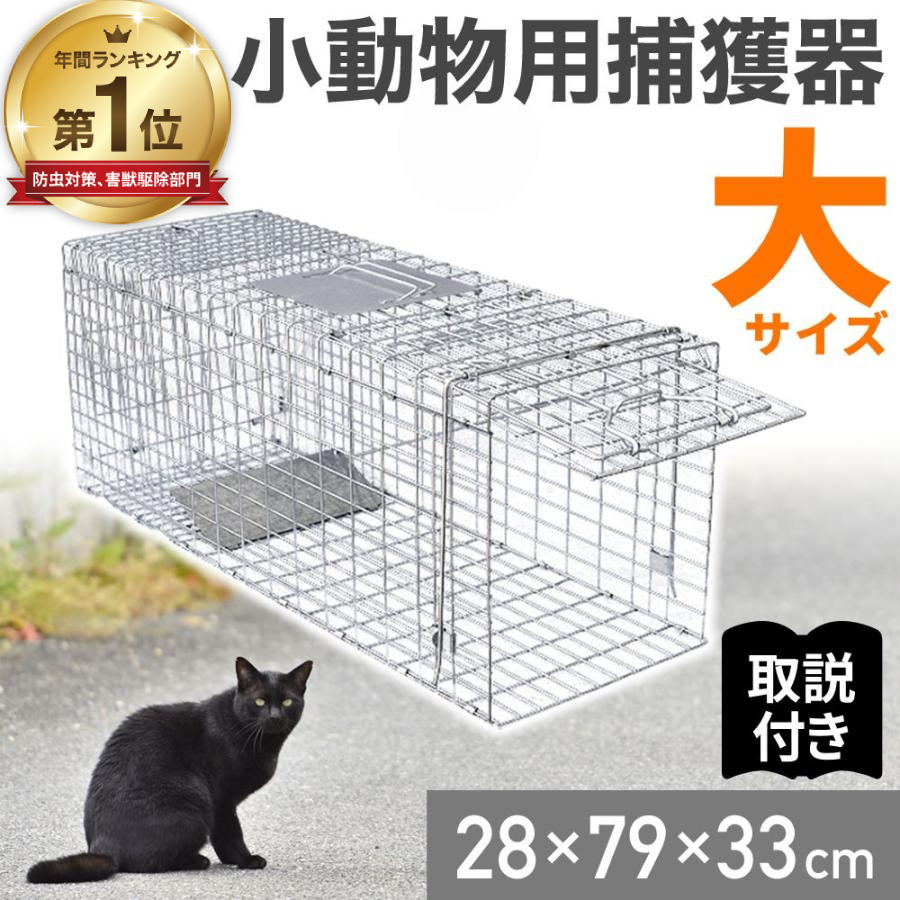 【商品仕様】 本体サイズ:約全長79cm×幅28cm×高さ33cm 折りたたみサイズ:約91cm×28cm×4.5cm 重量:約3.8kg 捕獲可能動物(参考):野良猫 アライグマ タヌキ キツネ ハクビシン イタチ テン 【商品説明】 畑や庭に設置し、大切に育てた農作物や園芸植物などを動物から守ります。 ねずみやもぐらなどの小動物から、少し大きめなタヌキやアライグマも捕獲できます。 また、ご自身のペットが迷子になった時の保護する道具としてや、 ゴミ箱周りに置いて活用することも可能。 プレートに餌を引っ掛けておき動物がプレートを踏めば、 餌に釣られた動物が内部に閉じ込められます。 一度閉まると動物自ら出ることはできません。 薬物や毒物を使用しないので、畑や庭へはもちろん動物にも優しい作りとなっています。 動物を傷つけることなく捕獲器に誘導できます。 持ち手の下部分に鉄板を付けているため、 網の中から危害を加えられても怪我をしにくいです。 移動させる際も安全に持ち運べます。 女性でも簡単に組み立てられる折りたたみ式です。 折りたたむと極薄サイズになり、保管の際も幅をとりません。 動物愛護法や鳥獣の保護及び管理並びに狩猟の適正化に関する法律 (※鳥獣保護ノ狩猟ニ関スル法律)に準じてお使い下さい。 ※動物愛護法により、「動物をみだりに殺し傷つけた者は、 1年以下の懲役または100万円以下の罰金に処する。 また虐待を行った者は30万円以下の罰金に処する。」と定めています。 この捕獲器を動物へのイタズラ、虐待の目的には絶対に使用しないで下さい。 |