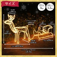 【 全長175cmの本格派トナカイ 】 置いておくだけでクリスマスの雰囲気を味わえます。 ・頑丈で質の良いロープライト ライト1つ1つが頑丈で、長く使い続けられる代物。 独立式なため、コンセントがあればどこでも設置OK! 屋外設置ができる便利な防滴・防雨仕様です。 ・優しく温かみのある電球色のイルミネーション 独特の色合いを放つ白熱球は、置いてあるだけでホッと和む明かりです。 LED電球では表すことができない色味で、お庭や店舗を優しく照らします。 ロープライトで繋げたトナカイとソリは、雰囲気を盛り上げること間違いなし♪ ・多様に活躍するモチーフライト お庭や店舗でのディスプレイをはじめ、ご家庭のツリーの側に飾ったり、 イベントやアミューズメントパークでの使用など様々な場所にお使い頂けます。 〔商品詳細〕 サイズ(約):組み立て後 全長/175cm トナカイ/全長69.5×67×14cm ソリ/全長59×23×29cm ※全長サイズは商品により、トナカイとソリをつなぐ部分の ロープライトの長さの違いで多少前後します。 電源コード:約1.5m 防水性能: 防雨仕様 ※同梱不可商品 |