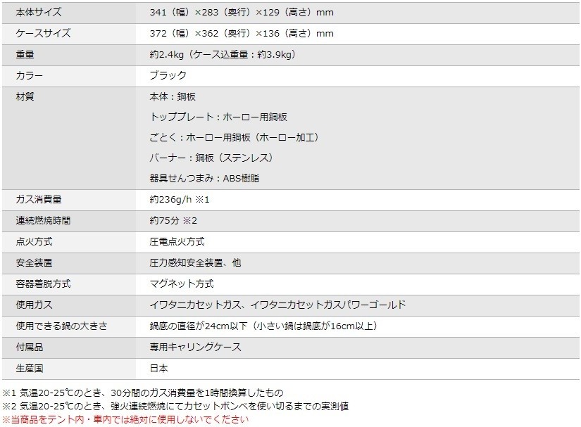 連続燃焼時間:約75分 (気温20〜25℃のとき強火連続燃焼にてカセットボンベを使い切るまでの実測値)