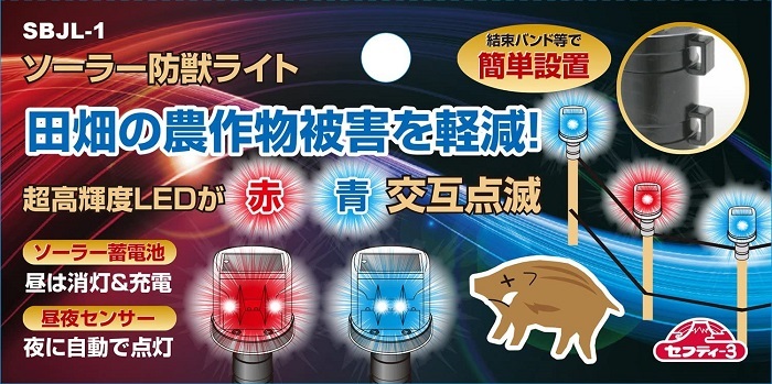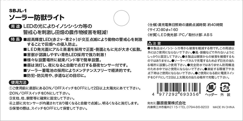| セフティー3 ソーラー防獣ライト SBJL-1 ・害獣が認識しやすい青色LED採用で強力に刺激 LEDの光により、 イノシシ シカ 等の警戒心を刺激し、田畑の農作物被害を軽減できます。 LED発光面にアルミ蒸着を採用しているので、正面・側面ともに光が大きく拡散します。 ・ソーラー蓄電池の採用によりメンテナンスフリーで経済的 昼は消灯し、夜になると自動で点灯する昼夜センサー付です。 様々な設置場所に結束バンド等で簡単に設置可能。 ※満充電無日照時の連続点滅時間:約100時間 ☆使用場所 庭 畑 田んぼ 農家 農場 果樹園 花壇 など 防犯 防災用 や 歩道 などの目印に ☆動物 シカ イノシシ サル 野良猫 野良犬 鼠 アライグマ テン キツネ ウサギ タヌキ カラス コウモリ 鳩 スズメ ハクビシン ※全ての動物に効果がある保証は御座いません。 〔商品詳細〕 サイズ:径80×160mm 電源:ソーラー充電 連続点滅時間:約100時間 LED発光部:PC 取付け部:ABS |