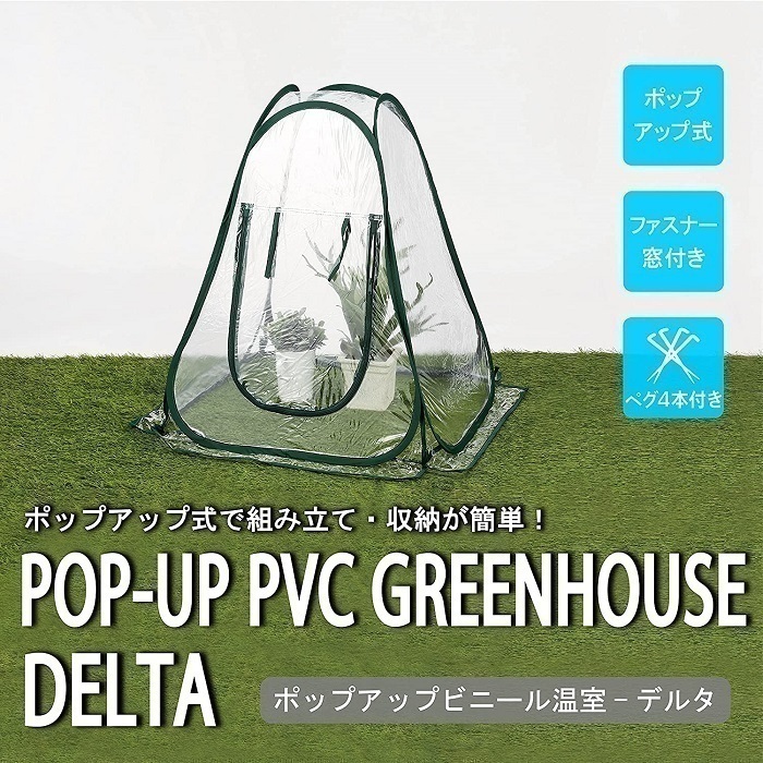 ポップアップビニール温室 デルタ PAOS-1 ビニール温室で冬場の植物を守りましょう♪ 寒い季節の雪や霜は植物たちの天敵です。 ビニール温室に入れてあげることで、 冷たい風や霜などが、直接当たるのを防ぎます。 お庭やベランダでガーデニングを楽しみたい方必見!! コンパクトサイズなのでお庭の隅っこや、ベランダにも設置できます。 ポップアップ式で簡単組み立て ペグ4本付きでしっかり固定もできます。 ※勢いよく展開する場合がありますので、十分ご注意ください。 使用しないときはコンパクトに収納 折り畳み式だから、使用しないときは場所をとりません。 コンパクトサイズの軽量設計なので持ち運びしやすく携帯性も便利です。 ファスナー付きの窓 鉢植えの出し入れや通気に便利な窓付き! ファスナーで簡単に開閉でき、カバーの前の部分を巻き上げて留めておくことができます。 カバーを全て外す手間がないので、水やりの時も便利です。 〔商品詳細〕 使用時:約幅70×奥行70×高さ80cm 収納時:約39×4cm 材質:PVC、スチール、ポリエステル JANコード:4545244604592 |
