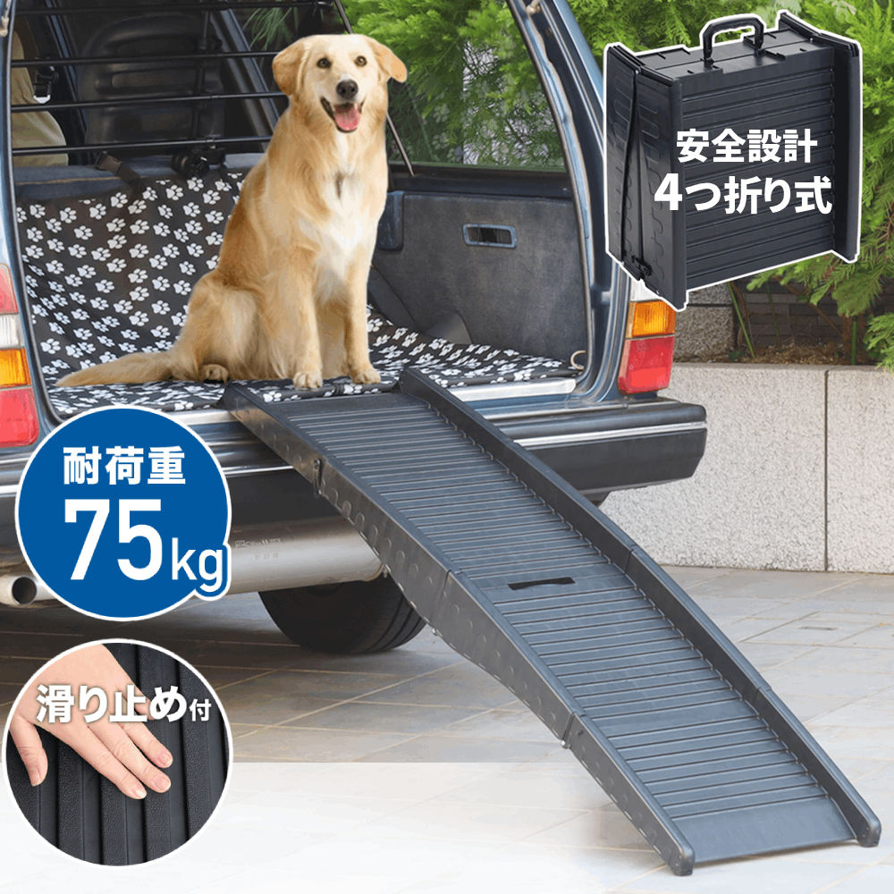 | 4つ折りドッグスロープ ・大型犬・老犬をサポート 車やクリニックの診察台など高い場所の昇り降りに役立つスロープ。 使用することによって緩やかな勾配を作ることができ、 大型犬や老犬の体への負担を減らすことができます。 ペットを抱きかかえる必要がないので、飼い主さんも大助かりのアイテムです。 ・安全面に配慮 スロープ部分は滑りにくい凹凸仕様。 裏側には滑り止めが付いています。 また、両サイドには高さ約4.5cmのエッジが施されており、 足を踏み外しにくい設計となっています。 ※より滑りにくくするには別途滑り止めマットなどをご用意ください。 ・便利な4つ折り式 折りたためば省スペース収納が可能。 車に積んでおく際も、かさ張らずコンパクトに収納しておけます。 持ち運びの最中に本体が開いてしまわないよう、ストッパー付き。 〔商品詳細〕 サイズ: 展開時/(約)高さ150×幅40×奥行11(cm) 収納時/(約)高さ42×幅40×奥行25(cm) エッジ/(約)高さ4.5cm 重量:(約)4.2kg 耐荷重:75kg 材質:PP |
