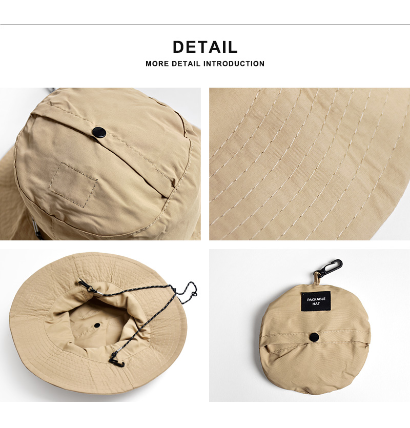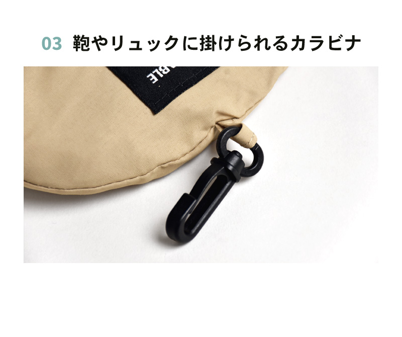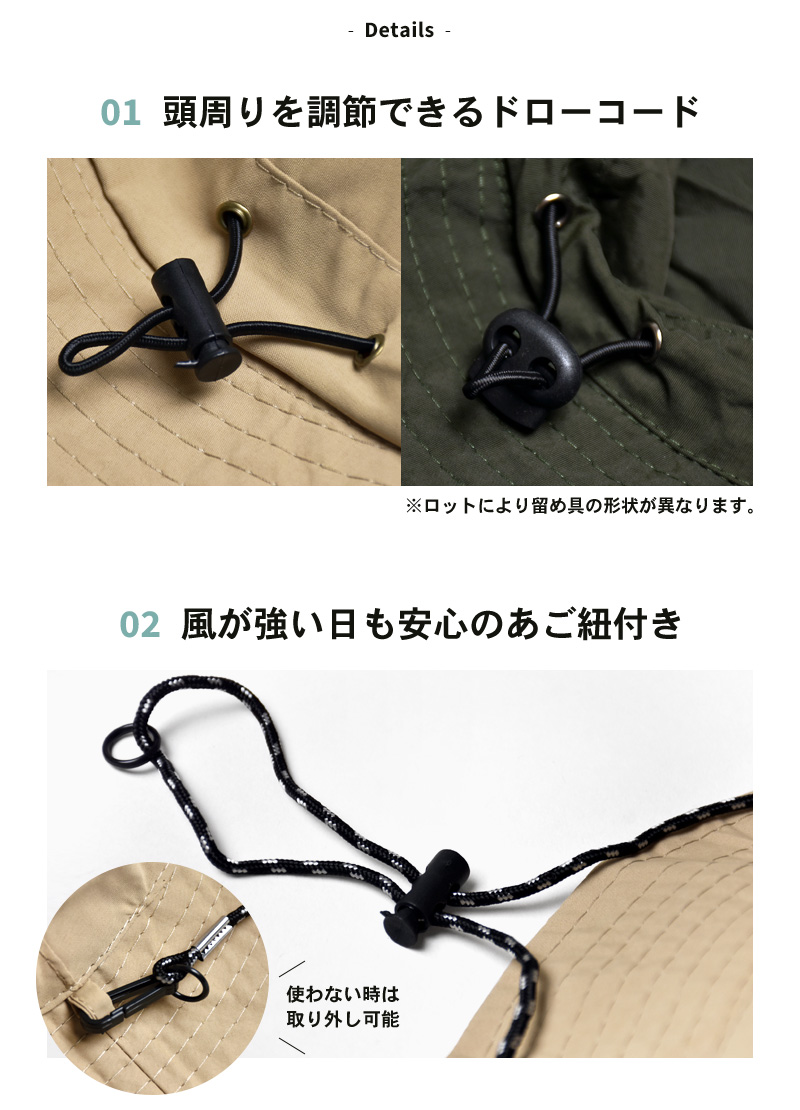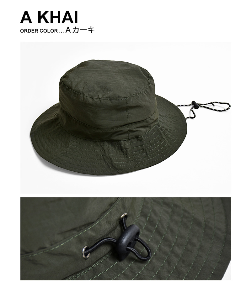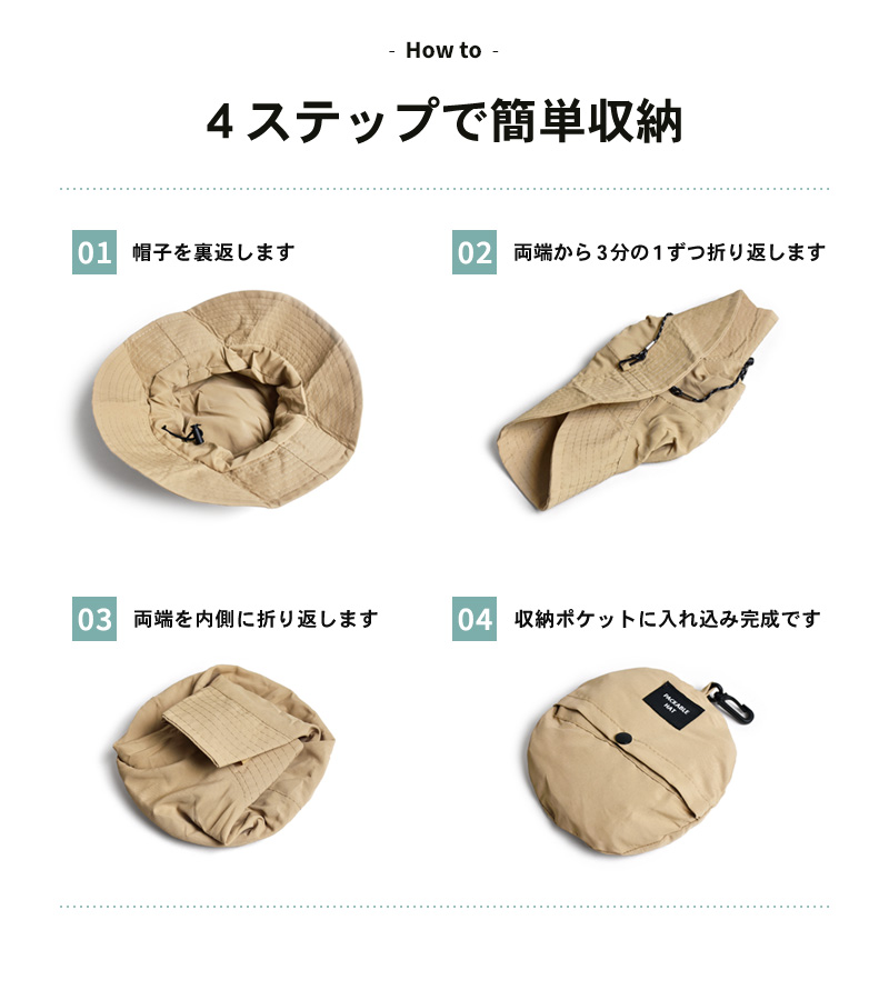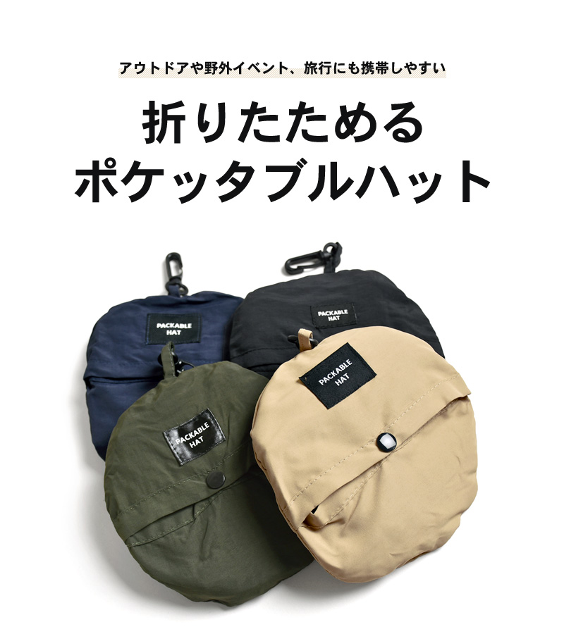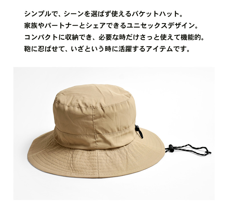 折りたたんでコンパクトに収納できるバケットハット。旅先や野外イベントなど幅広いシーンで活躍。カラビナ付きなのでリュックやベルトループにぶら下げることも可能。アゴヒモ付きで風が強い時も安心です。