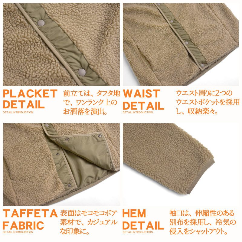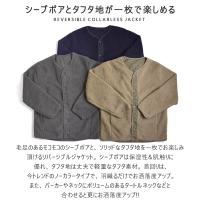 毛足のあるモコモコのシープボアと、ソリッドなタフタ地を一枚でお楽しみ頂けるリバーシブルジャケット。シープボアは保湿性&肌触りに優れ、タフタ地は丈夫で軽量なタフタ素材。首回りは、今トレンドのノーカラータイプで、羽織るだけでお洒落度アップ。また、パーカーやネックにボリュームのあるタートルネックなどと合わせると更にお洒落度アップ!!