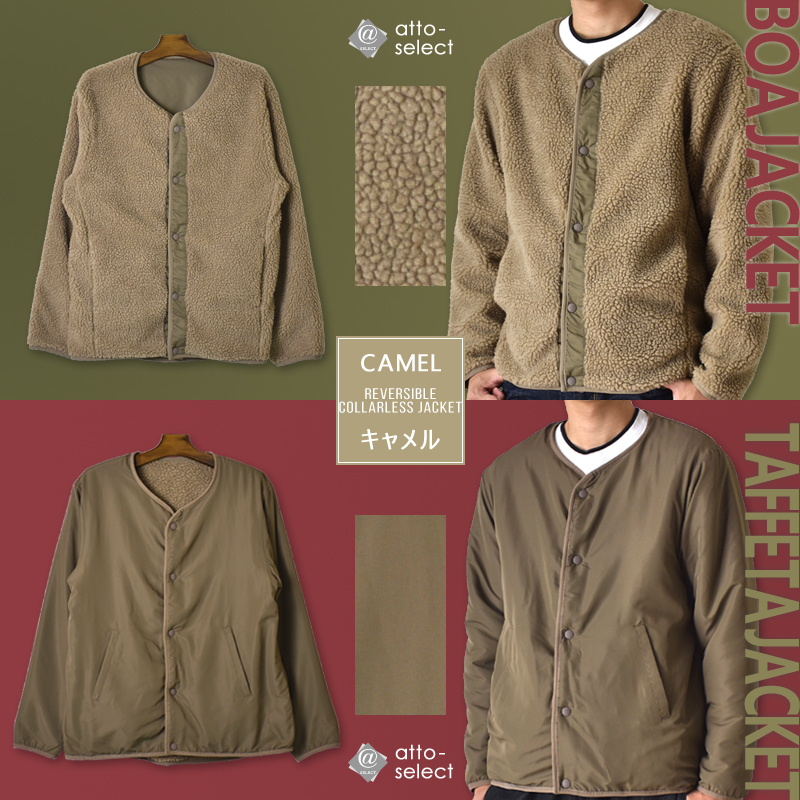 ノーカラー リバーシブル ボア ジャケット タフタ フリース ブルゾン アウトドア カーディガン ベスト 2WAY カーデ メンズ セール 通販 送料無料