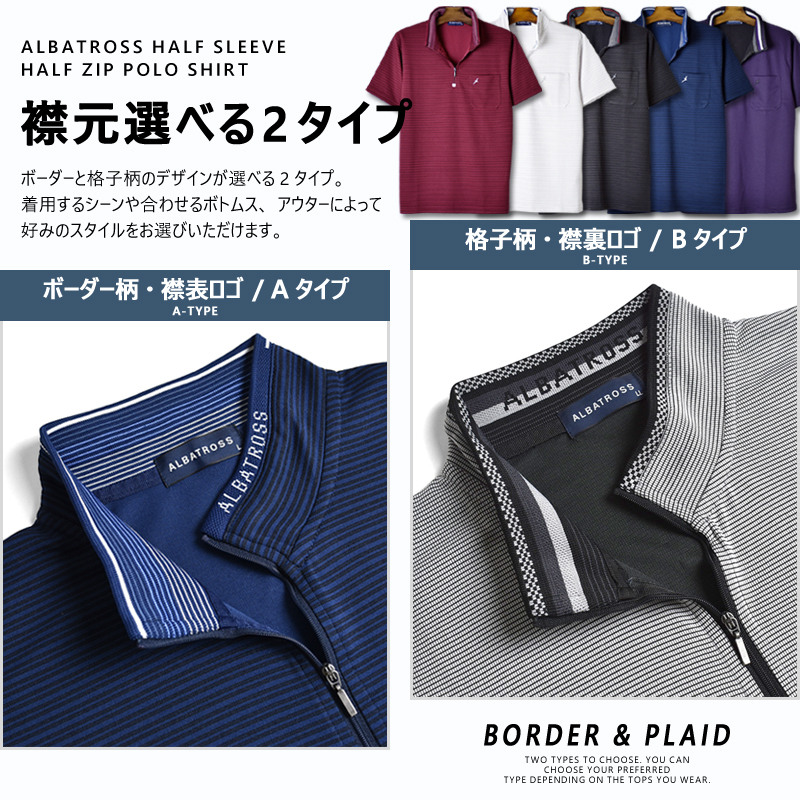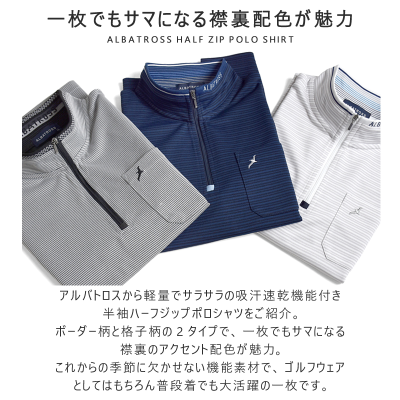 アルバトロスから軽量でサラサラの吸汗速乾機能付き半袖ハーフジップポロシャツをご紹介。ボーダー柄と格子柄の2タイプで、一枚でもサマになる襟裏のアクセント配色が魅力。これからの季節に欠かせない機能素材で、ゴルフウェアとしてはもちろん普段着でも大活躍の一枚です。