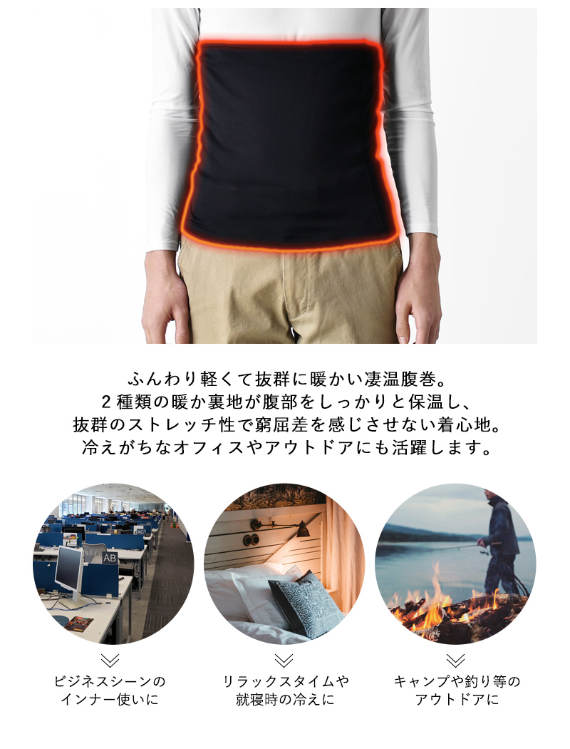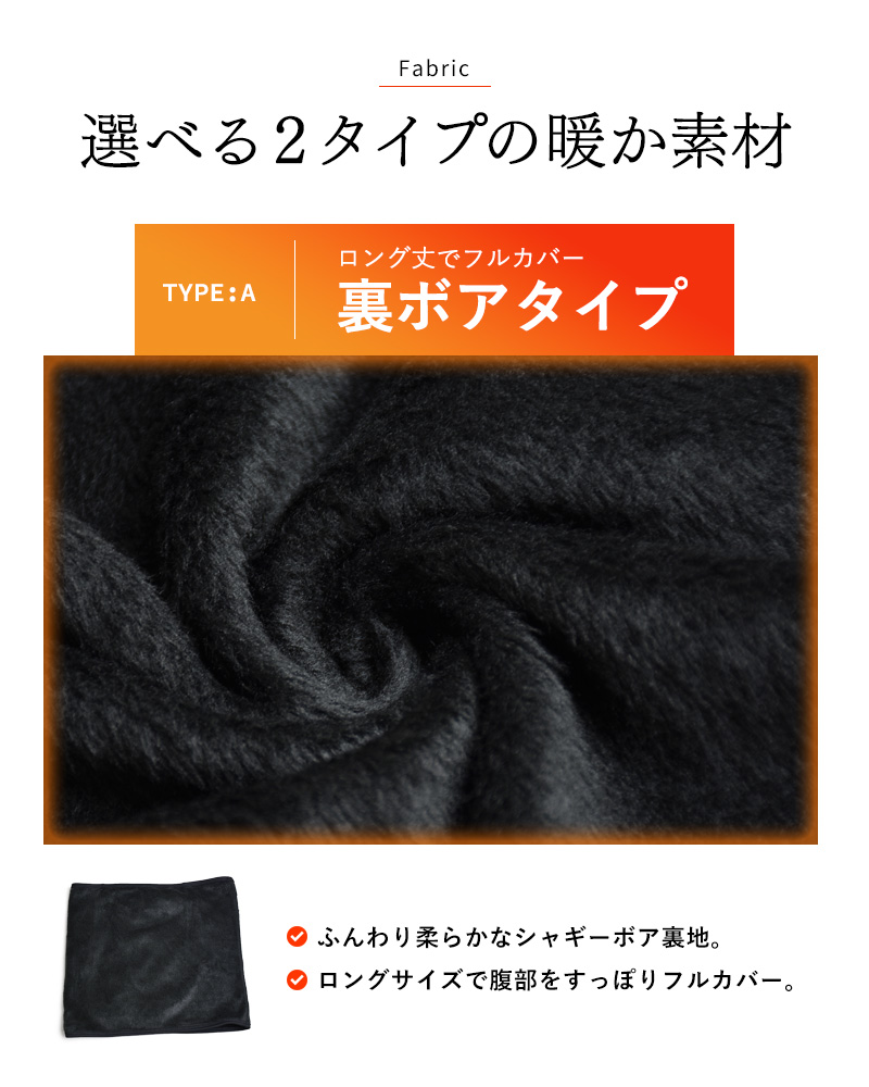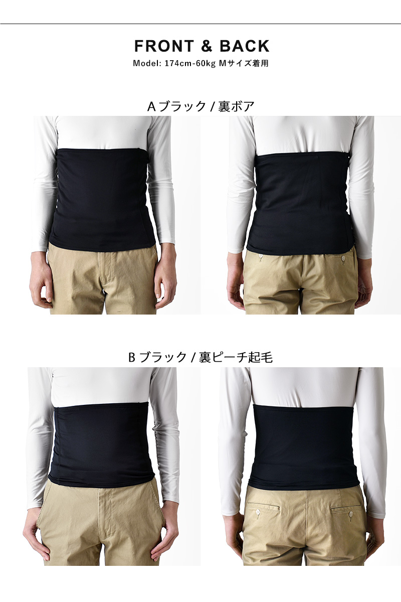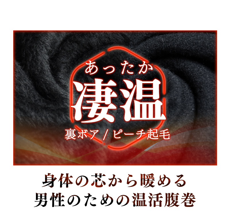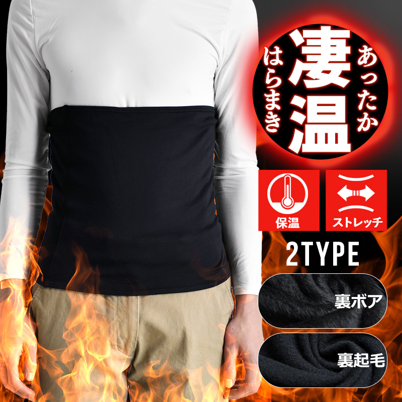 軽くて抜群に暖かいメンズ腹巻。身体の芯から暖まる裏起毛仕様。裏ピーチ起毛とロング丈裏ボアの2タイプを展開。ストレッチ素材で伸縮性があるので、リラックスして着用可能。普段使いはもちろん就寝時にも活躍する便利アイテム。