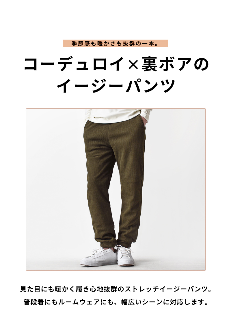 寒さが厳しい季節でも快適に過ごせる、メンズコーデュロイパンツ。裏ボアがあたたかく、履くだけでしっかり保温。テーパードシルエットに仕上げているため、見た目はスマートで、動きやすさも損なわずアクティブに着こなせます。ストレッチ素材を採用しているので、日常の動作やお出かけの際もストレスなく快適。厚手で防寒性も高く、秋冬のカジュアルスタイルにぴったりな一本です。
