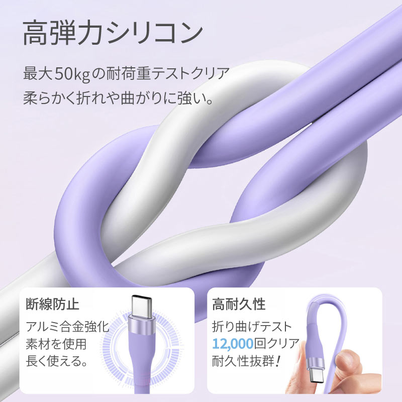 最大出力60Wの高出力で、スマートフォン、タブレット端末、ノートPC等のUSB-C端子機器にフルスピード充電が可能な充電コードです。