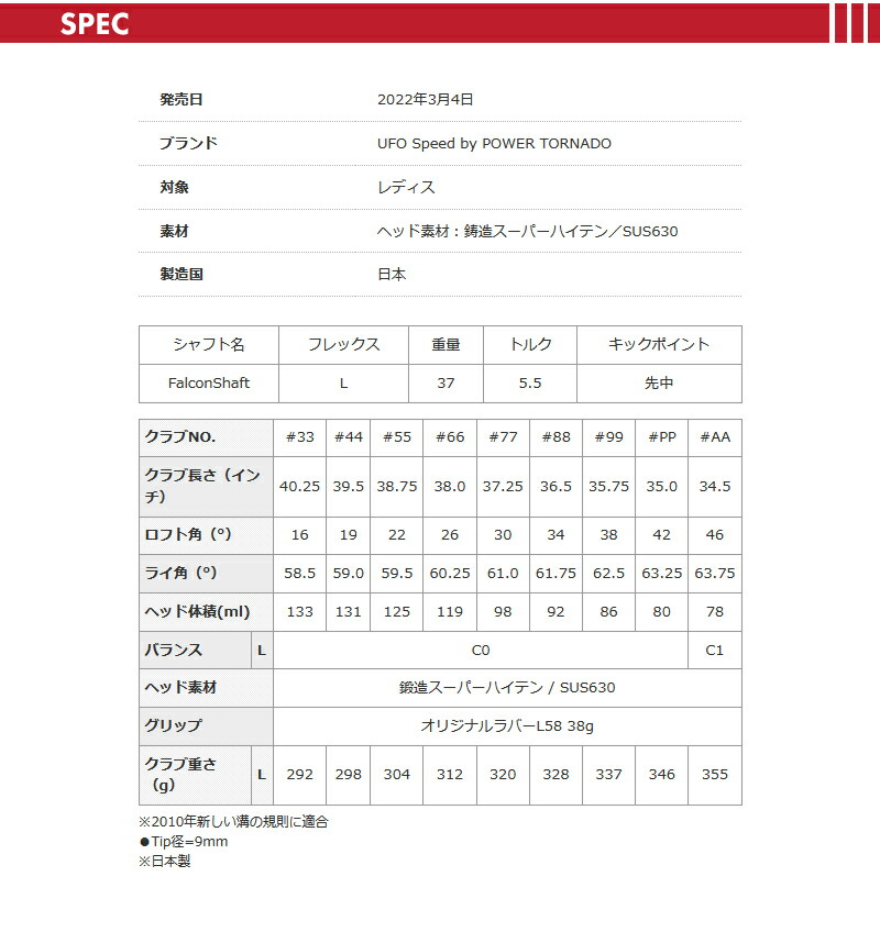 ロフト角:#33[16度],#44[19度],#55[22度],#66[26度],#77[30度],#88[34度],#99[38度],#PP[42度],#AA[46度]