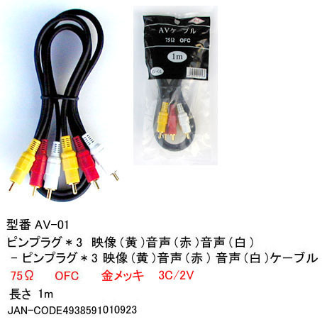【AV-01】AVケーブル RCAピンプラグx3(黄/赤/白) 1m