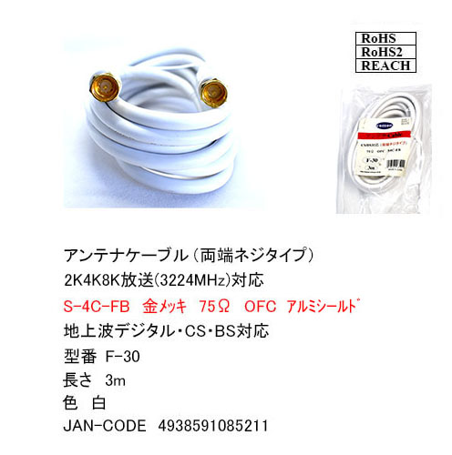 【F-30】アンテナケーブル(白) 3.0m 同軸 S4C-FB 地デジ対応 ネジ式 バルク発送(開封)