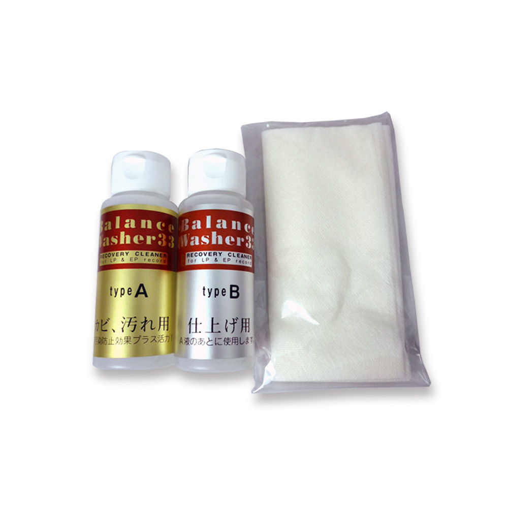 あまりにも有名なレイカのデビュー作レコード用クリーナー「レイカ バランスウォッシャー33(A・B各液62ml)」とクリーニングクロス「ビスコ33(5枚入)」のエクササイズセット。