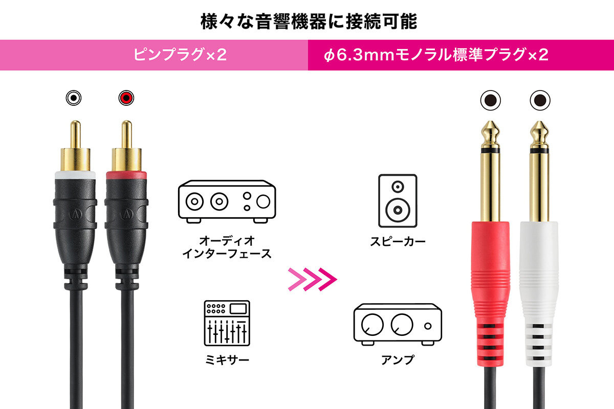 確かな品質とお客様が求める環境にマッチするケーブルを厳選し、日本のオーディオメーカーが誇る音質をお求めやすい価格で提供します。さらに、本ラインナップは楽器への接続とオーディオ機器への接続、両方に対応できる汎用性の高さも特長となります。ギターやベース、キーボードなど楽器への接続から、アンプやミキサー、インターフェースなどオーディオ機器への接続まで対応できるため、つないだ機器同士、あるいは音響システム全体の音質向上を図ることができます。