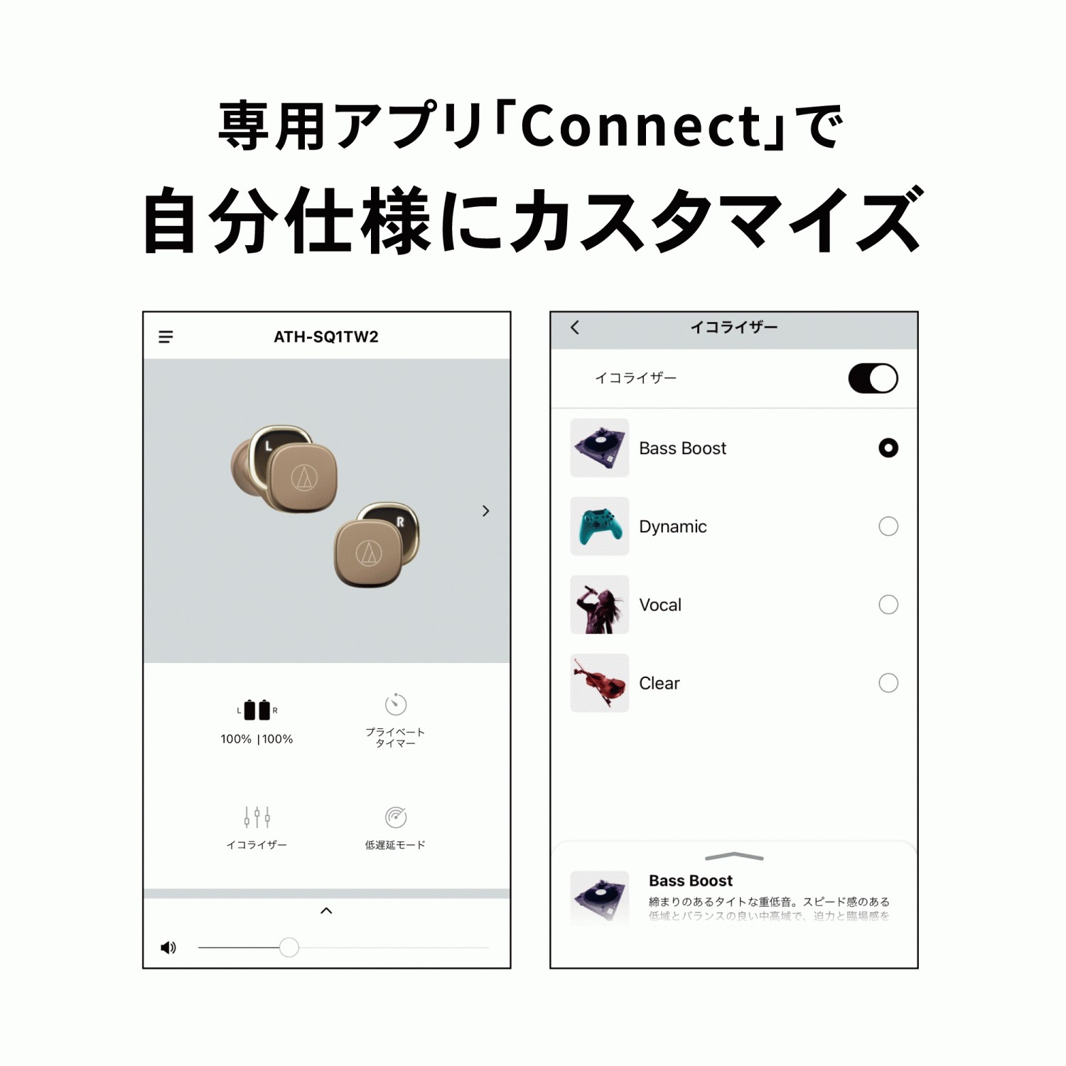 専用アプリ「Connect」内に、4種のプリセットイコライザーを用意。