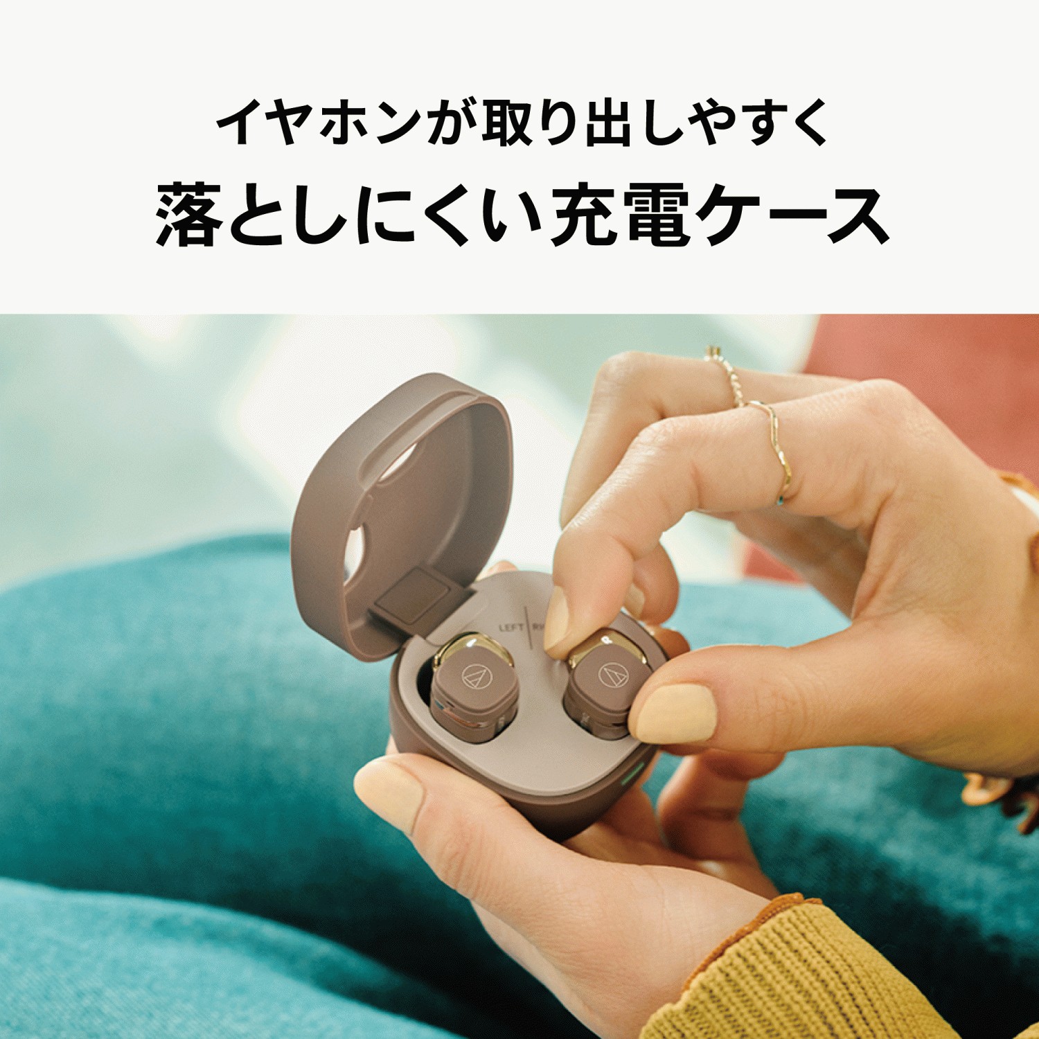 イヤホンのL/Rが光るため、明かりの少ない場所や環境下でも左右を間違えることなく、落ち着いて装着することができます。
