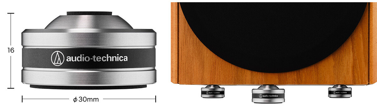 お客様の環境に応じて選べる2つのモデルをラインナップ。サイズはそれぞれ、直径約φ30mm/高さ約16mmの AT6099a(6個1組)と、直径φ20mm/高さ約11mmの AT6098a(8個1組)をご用意しました。お持ちのオーディオ機器に合わせてサイズを選んで設置することで音質向上を図れるだけでなく、新しい音との出会いもお楽しみいただけます。