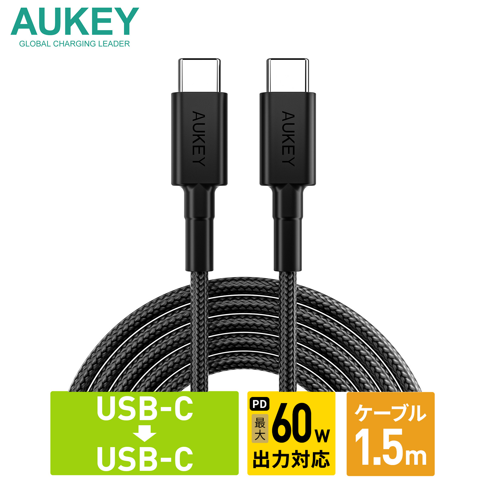 USB Type-C ケーブル C-C 1.5m PD 最大60W出力 高耐久 480Mbps 2年保証 AUKEY Impulse Series CB-CC15L