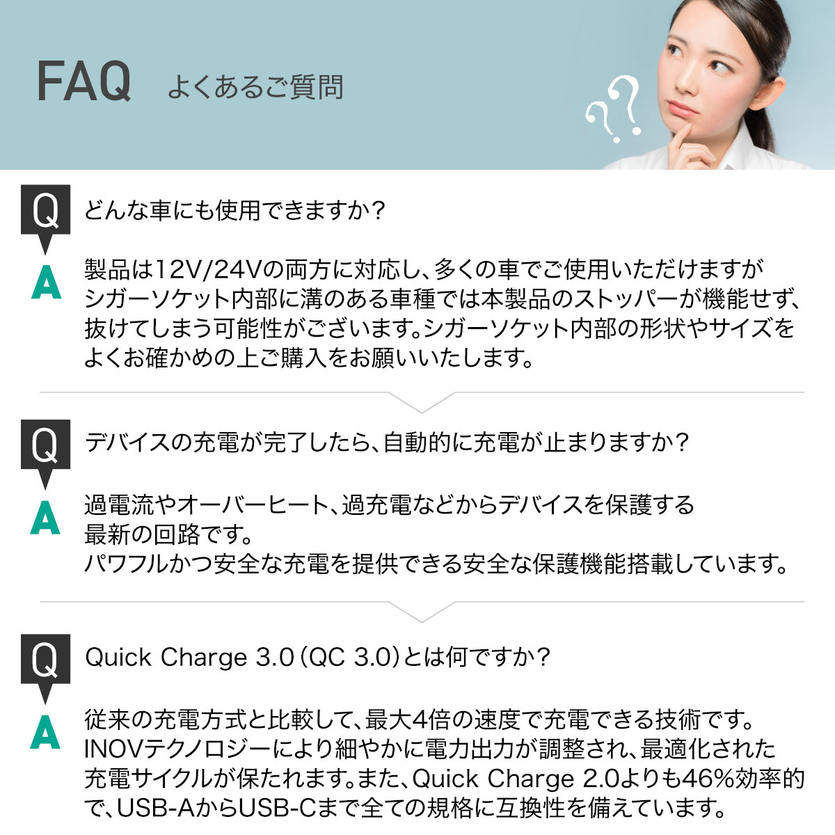 | USB-A出力 | (QC 3.0) 3.6-6.5V 3A / 6.5-9V 2A / 9-12V 1.5A (最大18W) |