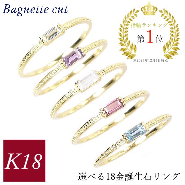 リング k18 18k 誕生石 天然石 バゲットカット バケット ピンキー 重ね付け 重ねづけ 18金ゴールド レディース 50代 40代 60代 30代 ミル打ち 華奢 指輪 女性用