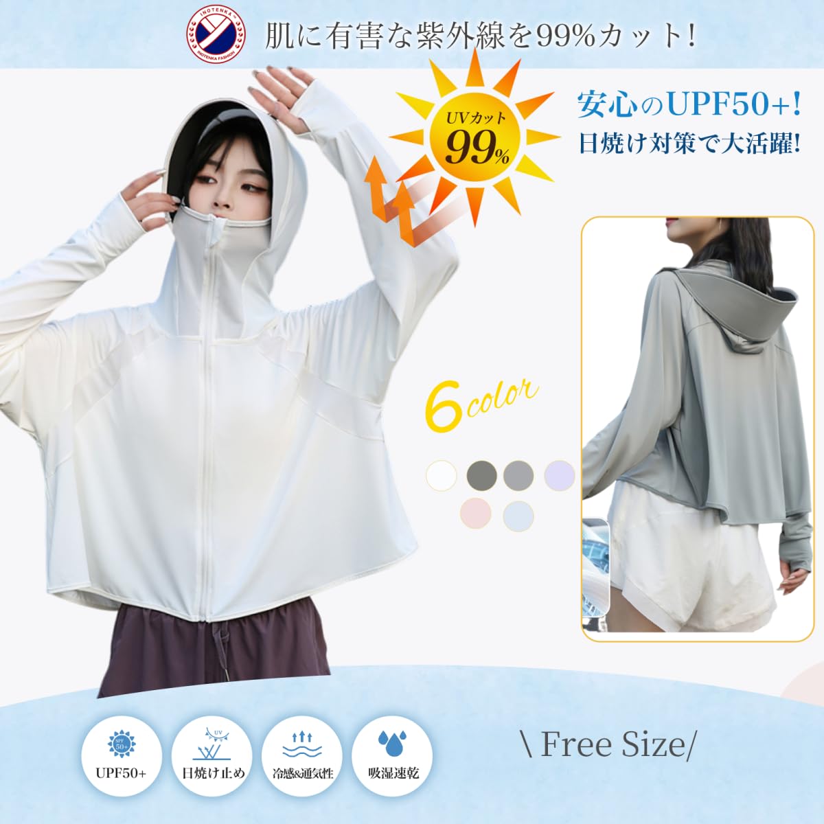 【6機能一体型】日よけ帽子、軽量コート、パラソル、マスク、アームカバー、日焼け止めクリームの機能を一つにまとめた、とても実用的な夏の日焼け止めに欠かせない薄手ラッシュガードです。