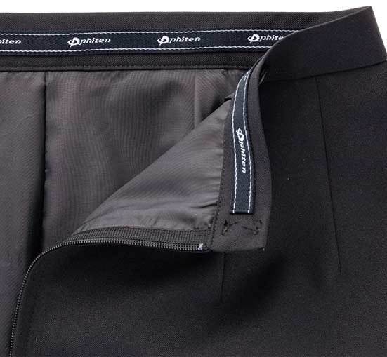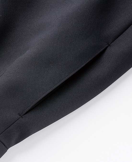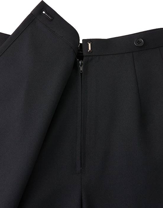 動きやすさと見栄えを兼ね備えたラップ式デザインで高級感をキープ。着脱するのが楽なフロントファスナー仕様。両脇には小物などを収納するのに便利なポケットが付いています。前後の覆い布で、前からも後ろからも巻きスカートのように見えます。オールシーズン対応。