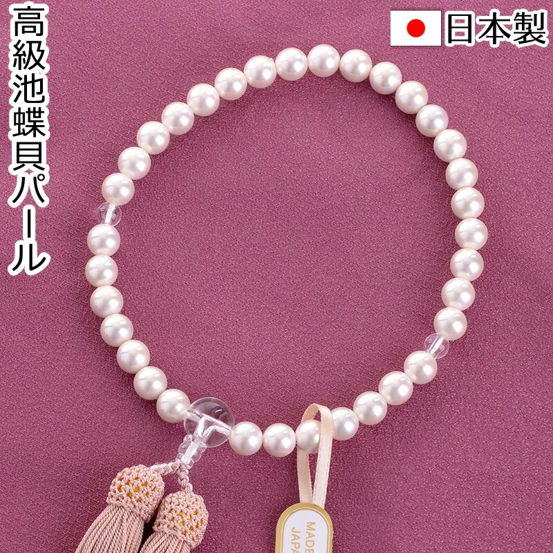 数珠 女性用 高級花珠イケチョウ貝パール念珠 片手8mm 二天珠水晶 頭付房 略式数珠 ブラックフォーマル 葬祭 葬式 通夜 告別式