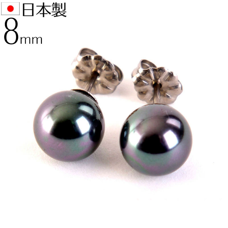 高級8mm南洋黒蝶花珠オーロラ本貝パールピアス チタンポスト・チタンキャッチ タヒチ黒蝶系 黒真珠系 宝飾店仕様 ブラックフォーマル 葬祭 葬式 通夜 告別式